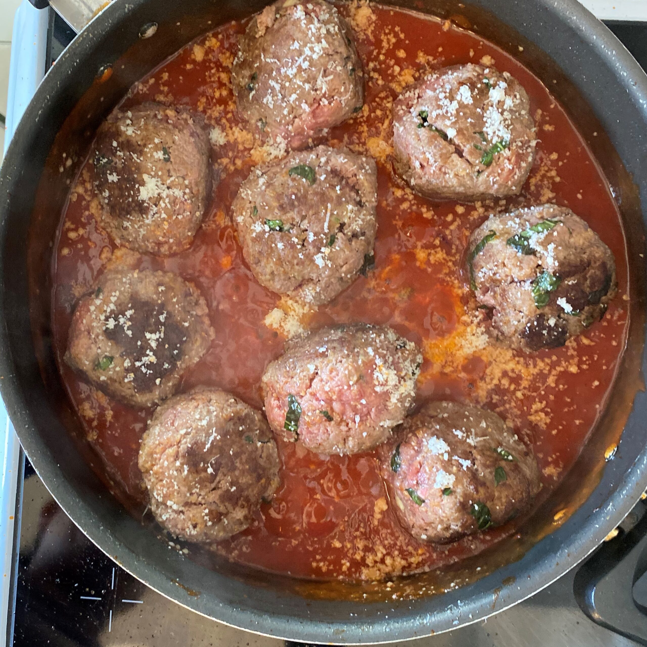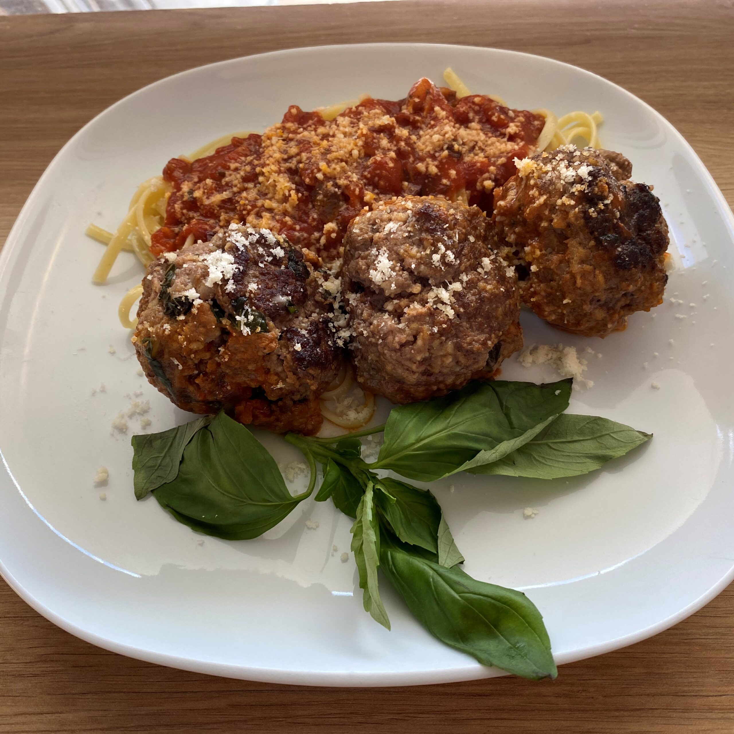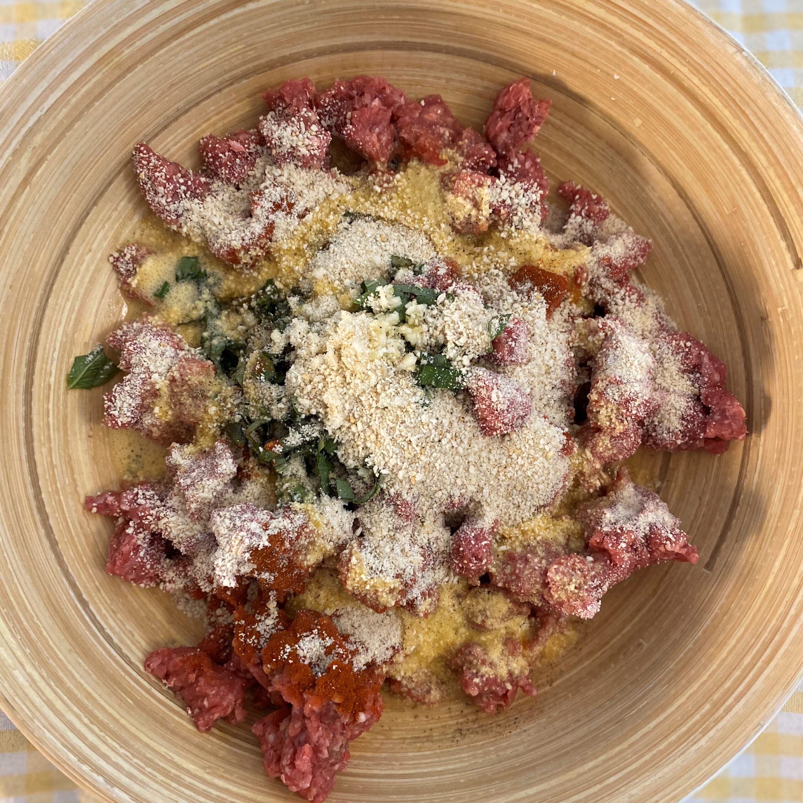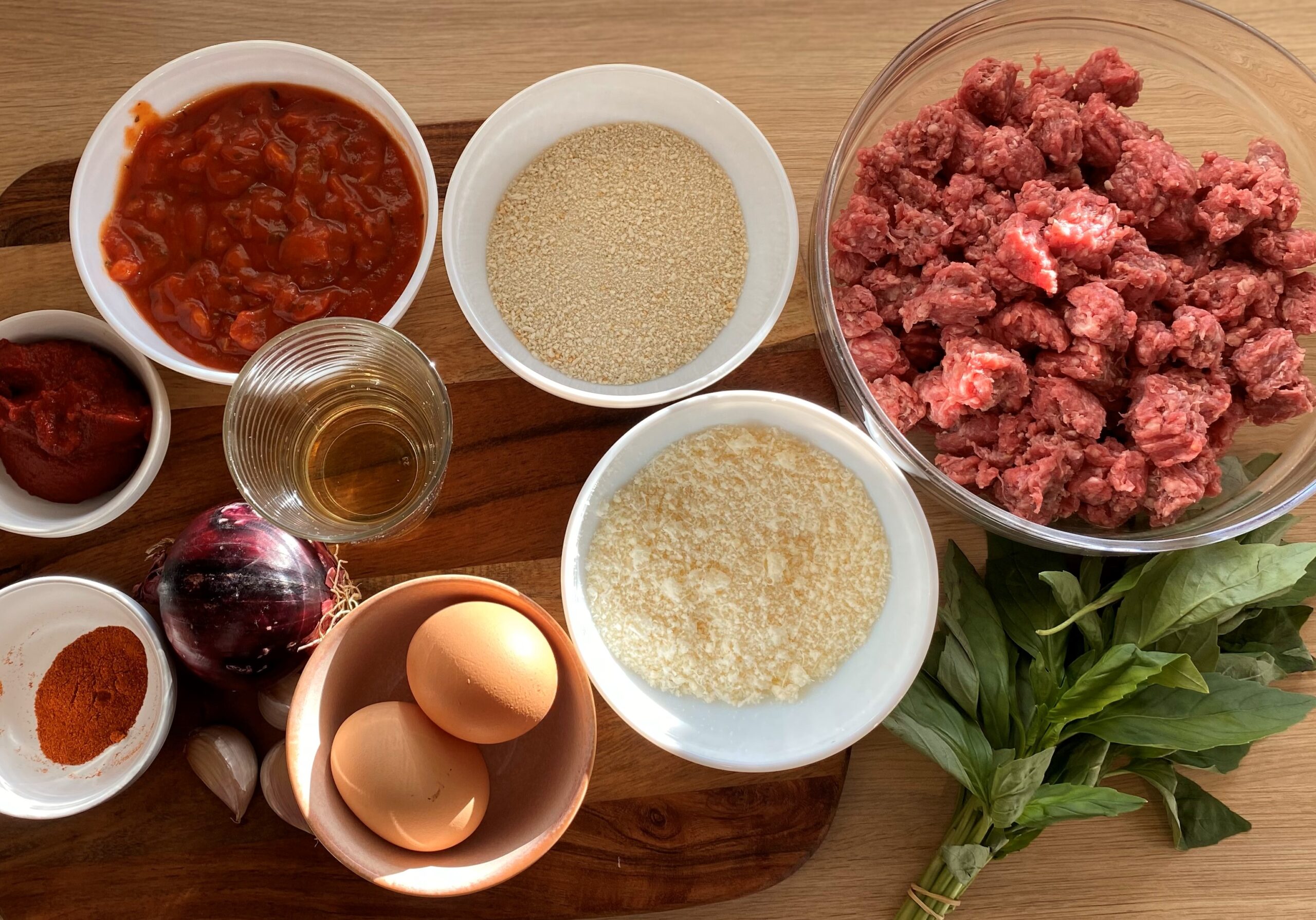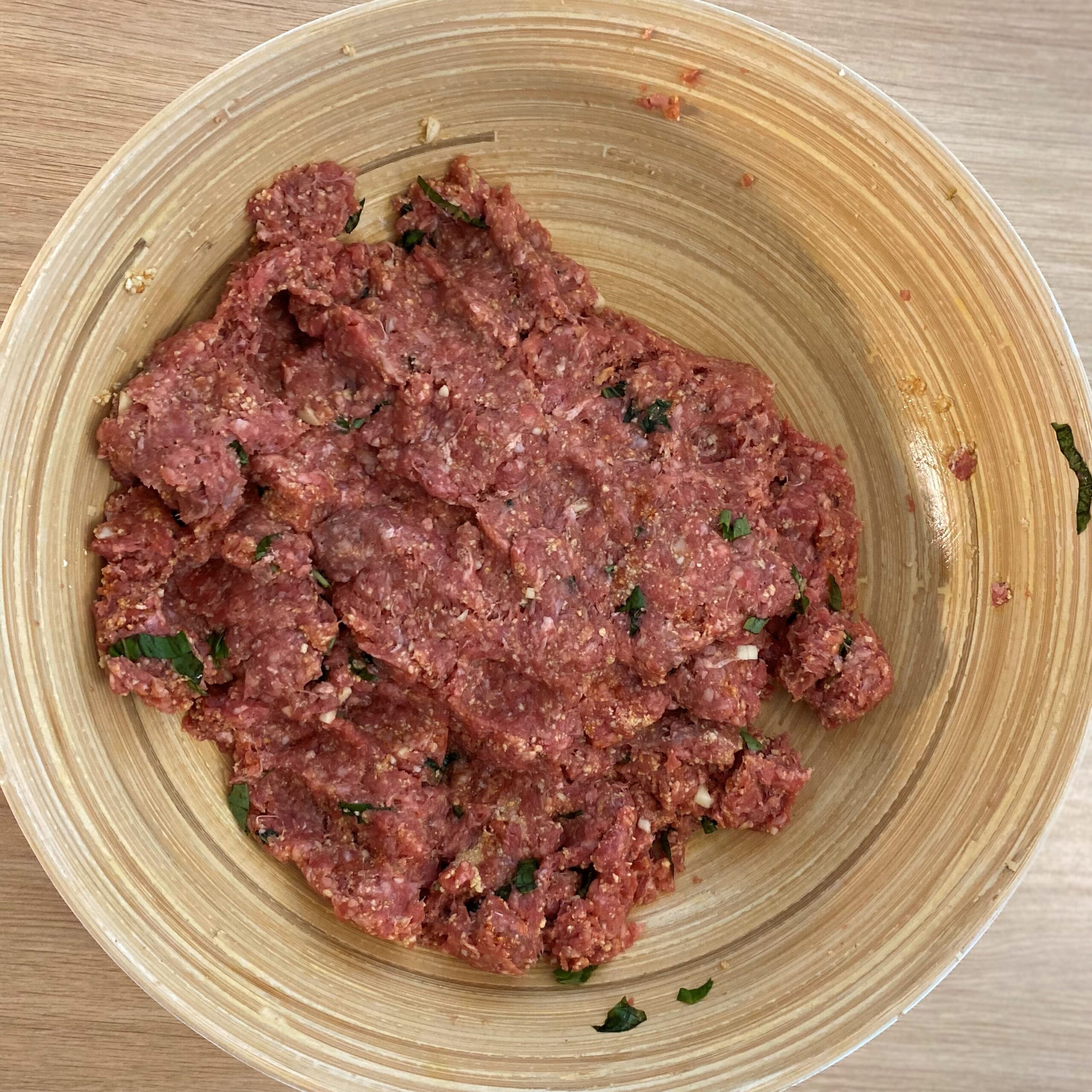 • dans un saladier , melangez la viande hachée , avec l ‘ail, les 2/3 du basilic , les oeufs battu, assaisonnez généreusement et mélangez et malaxez bien le tout avec les mains  formez les boulettes d’une taille moyenne