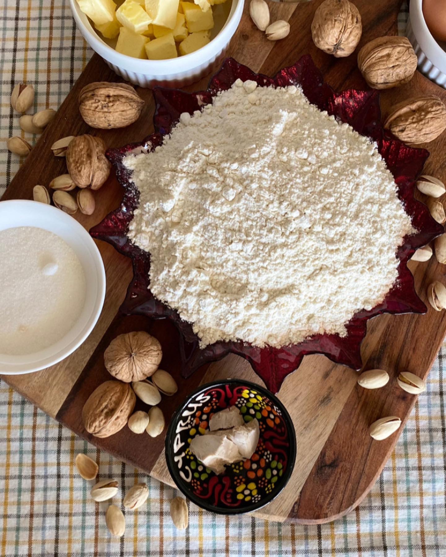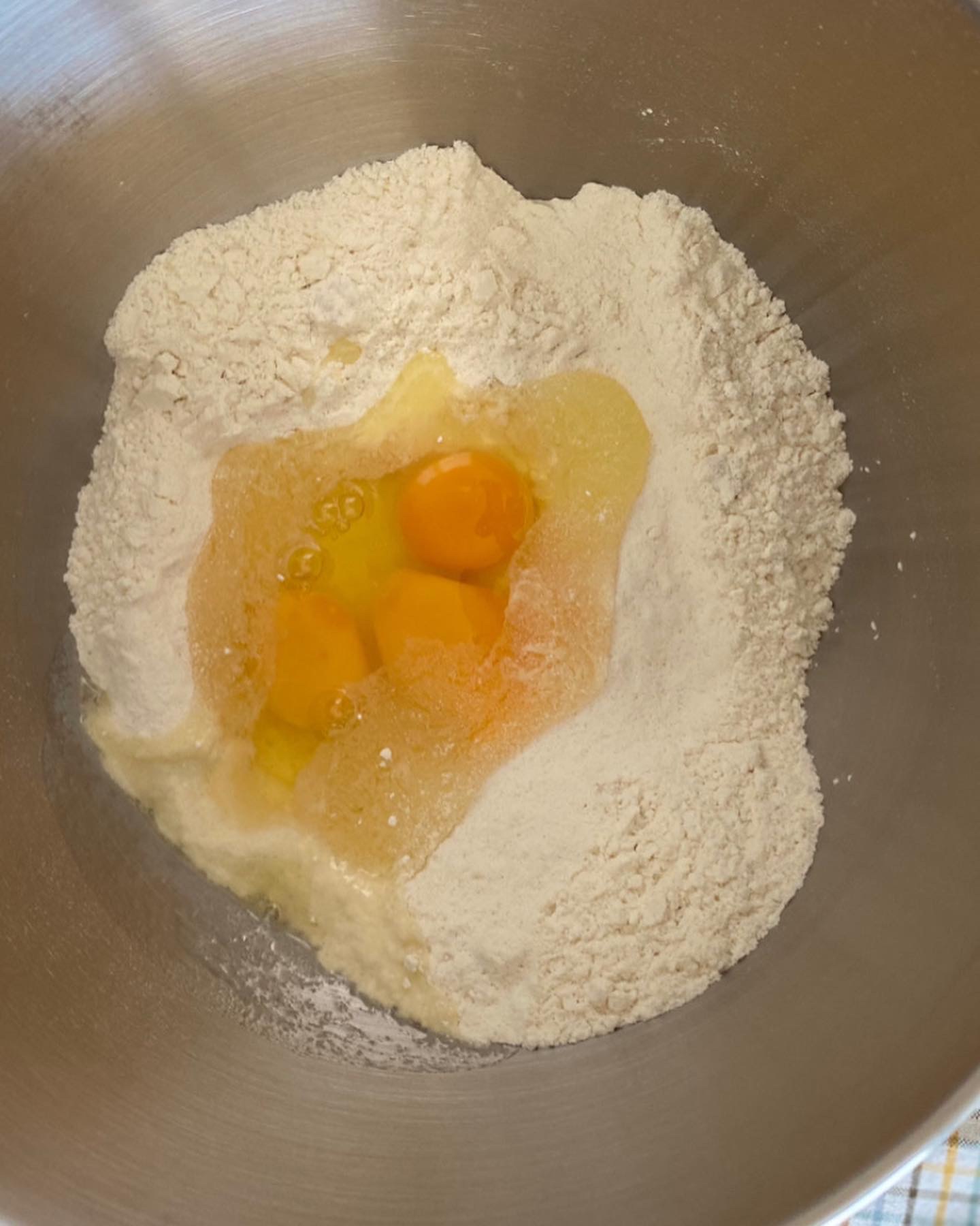 -tout d’abord, versez la farine, le sucre, le sel, la levure, dans la cuve du batteur mélangez le tout cinq minutes