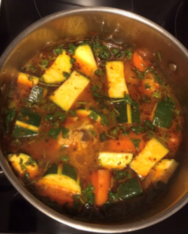 Enfin ajoutez les courgettes , les pois chiches et la coriandre ciselée laissez mijoter.