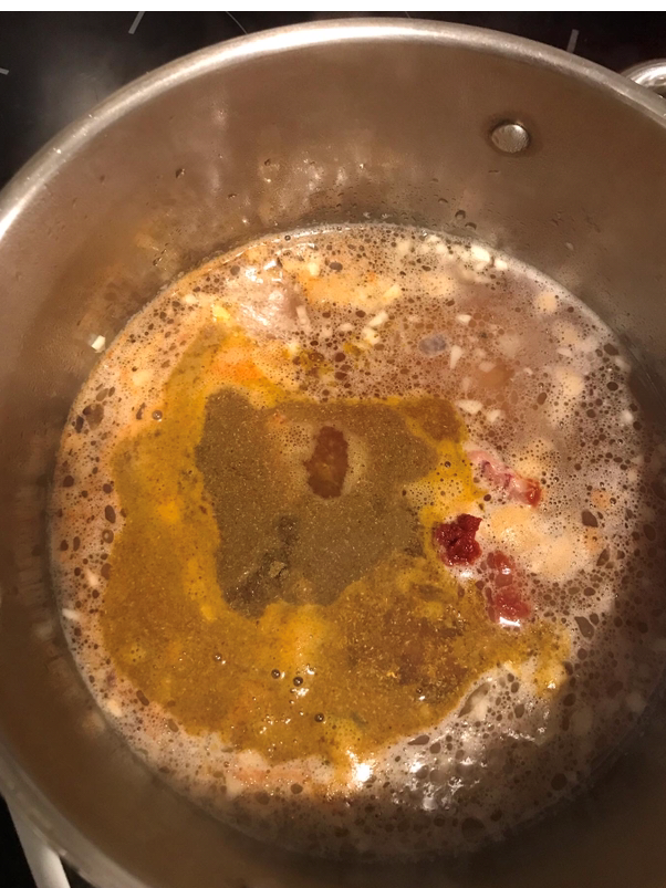-Ajoutez le concentré de tomate le bouillon de volaille puis les épices, mélangez laissez mijoter .