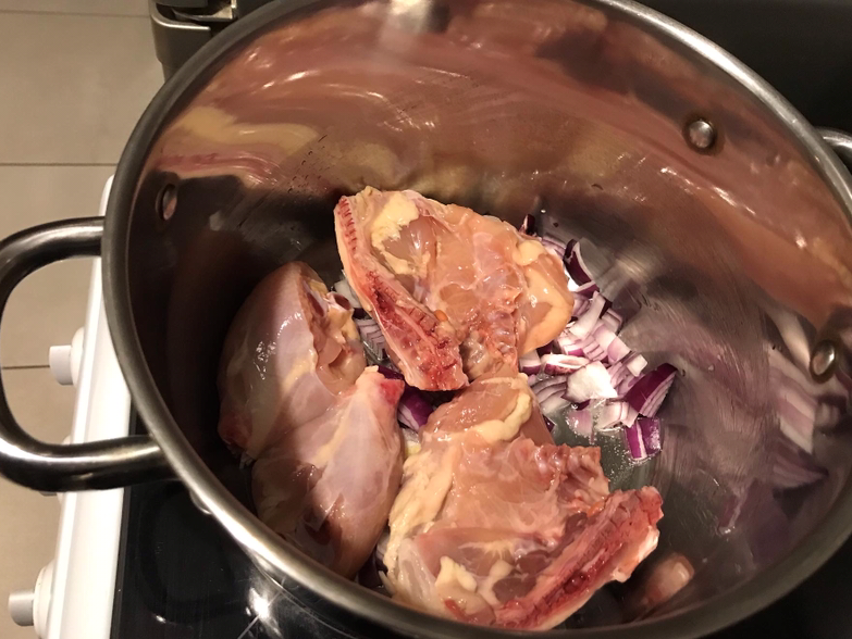 -Faire revenir les oignons et l’ail pendant 5 minutes, puis ajoutez le poulet faite revenir 5 minutes, couvrir a hauteur avec de l’eau tiède.