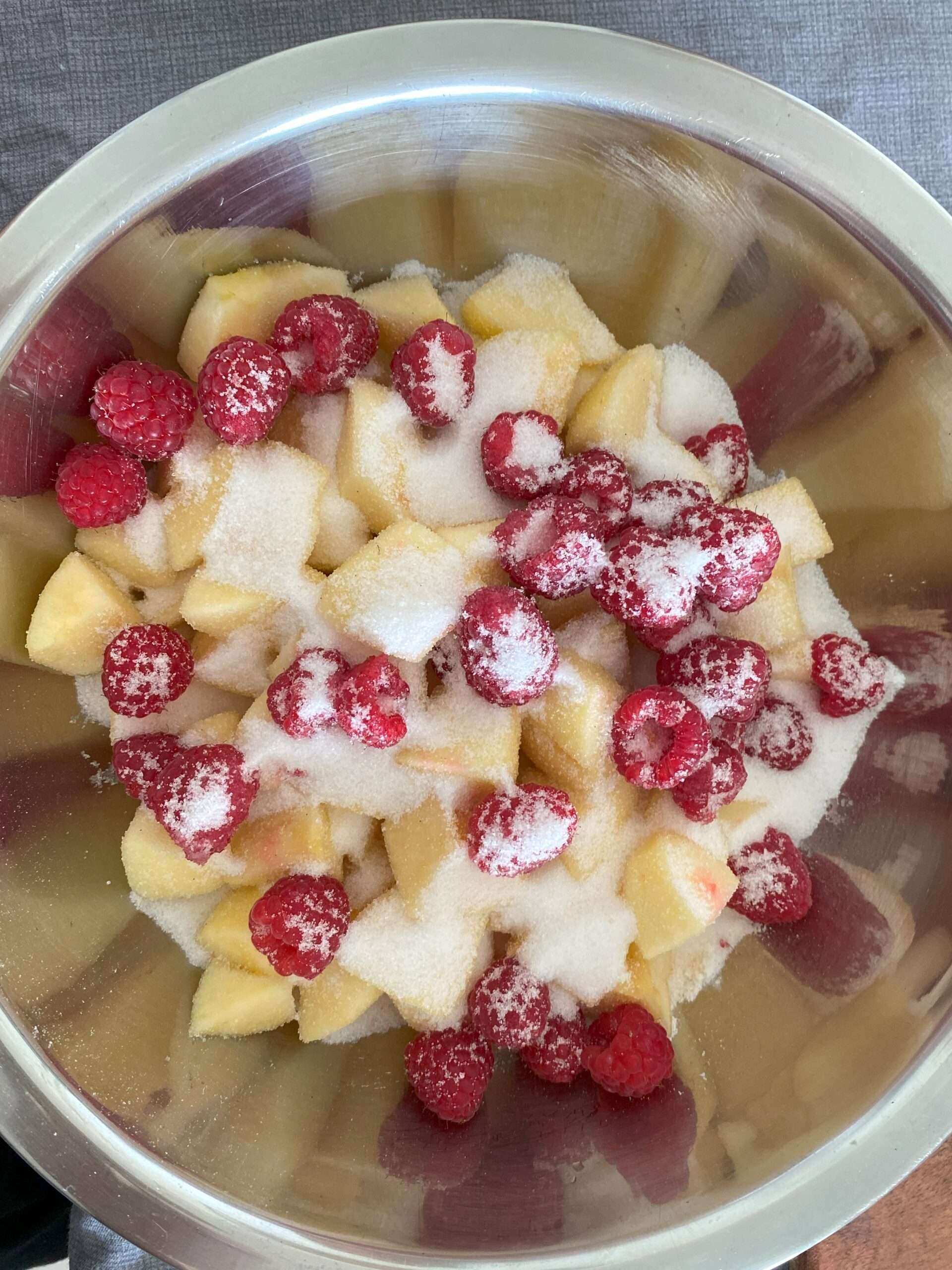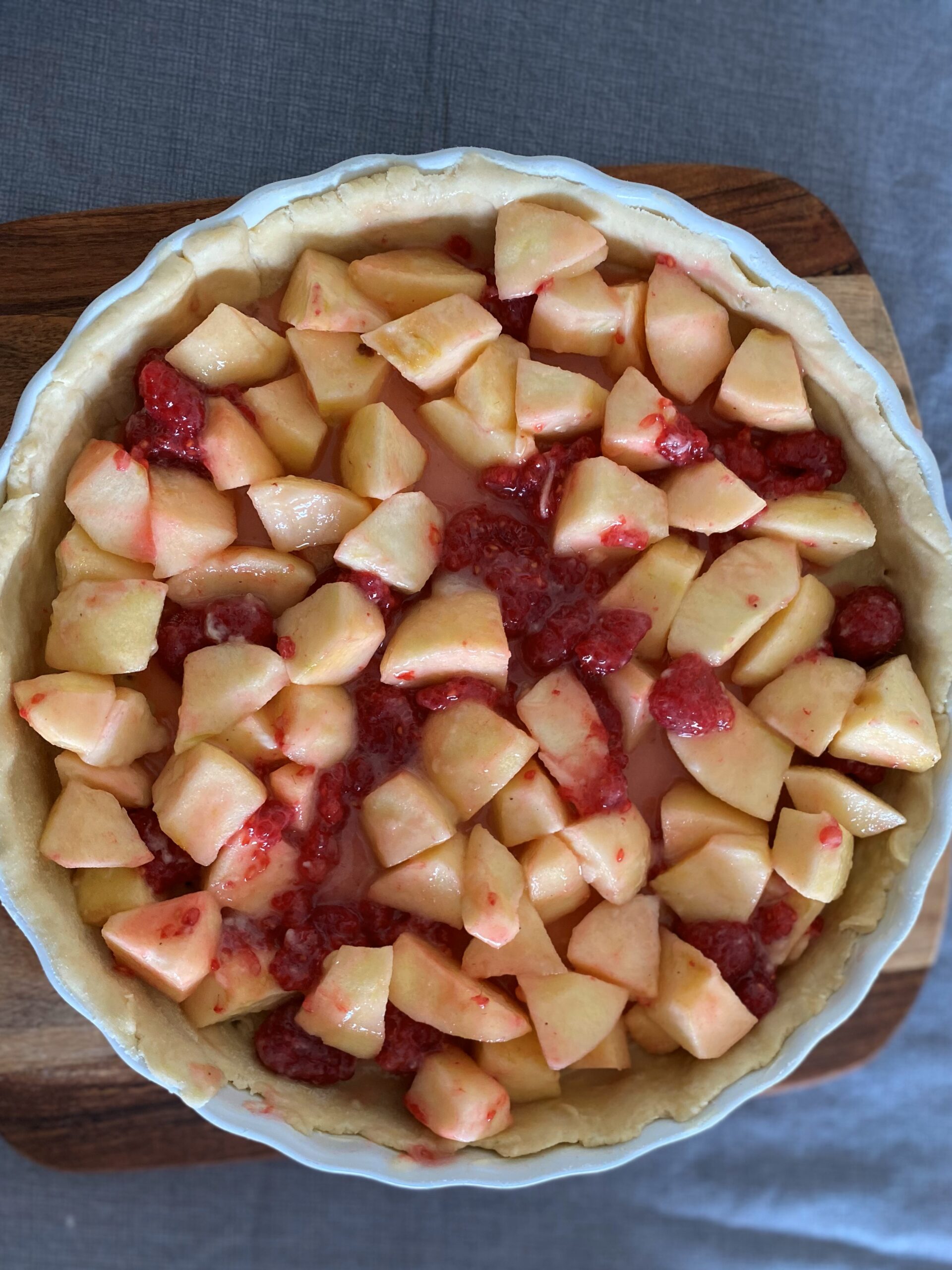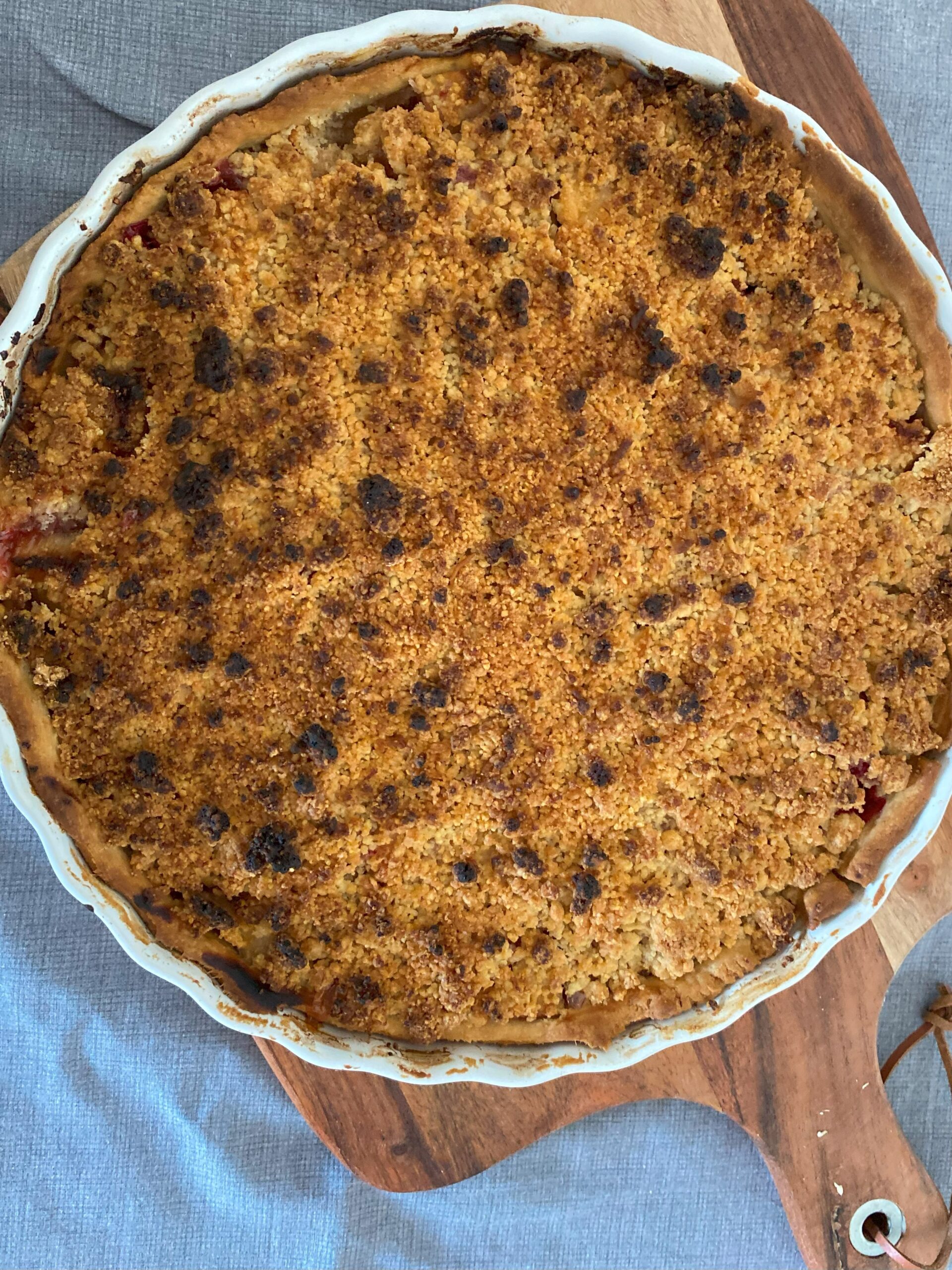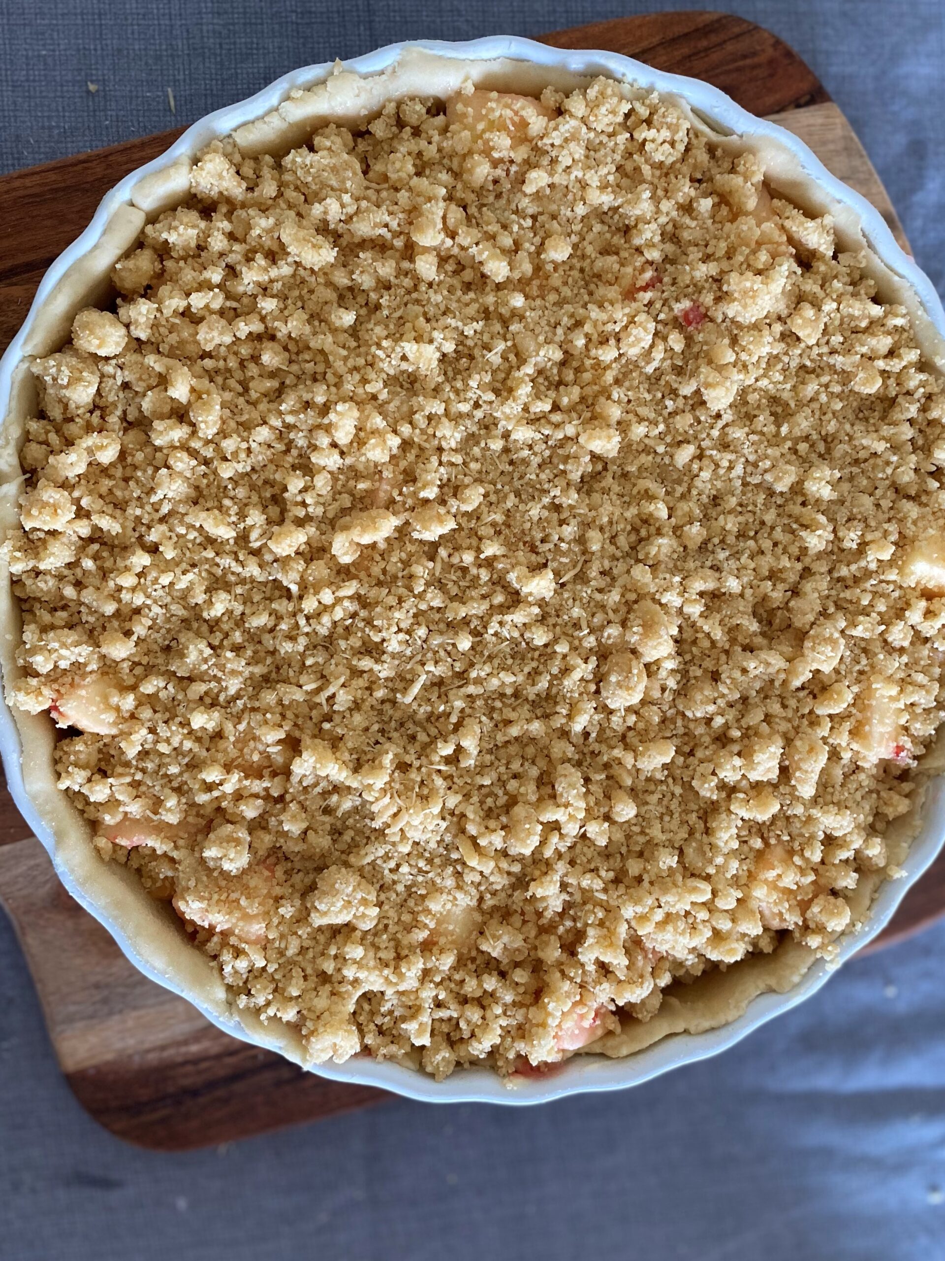 Disposez le crumble sur tout les fruits , jusqu’à tout recouvrir toute la surface de la tarte