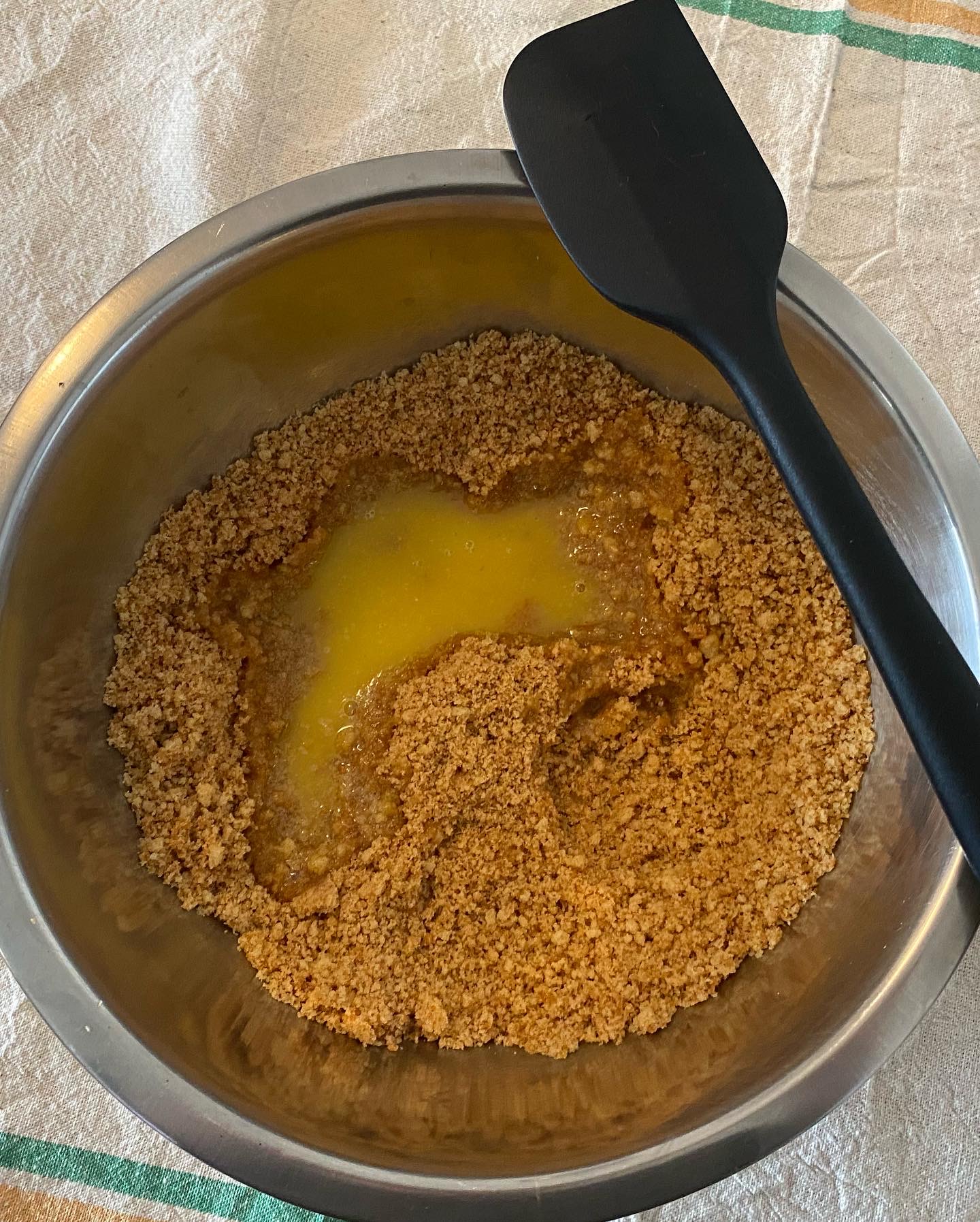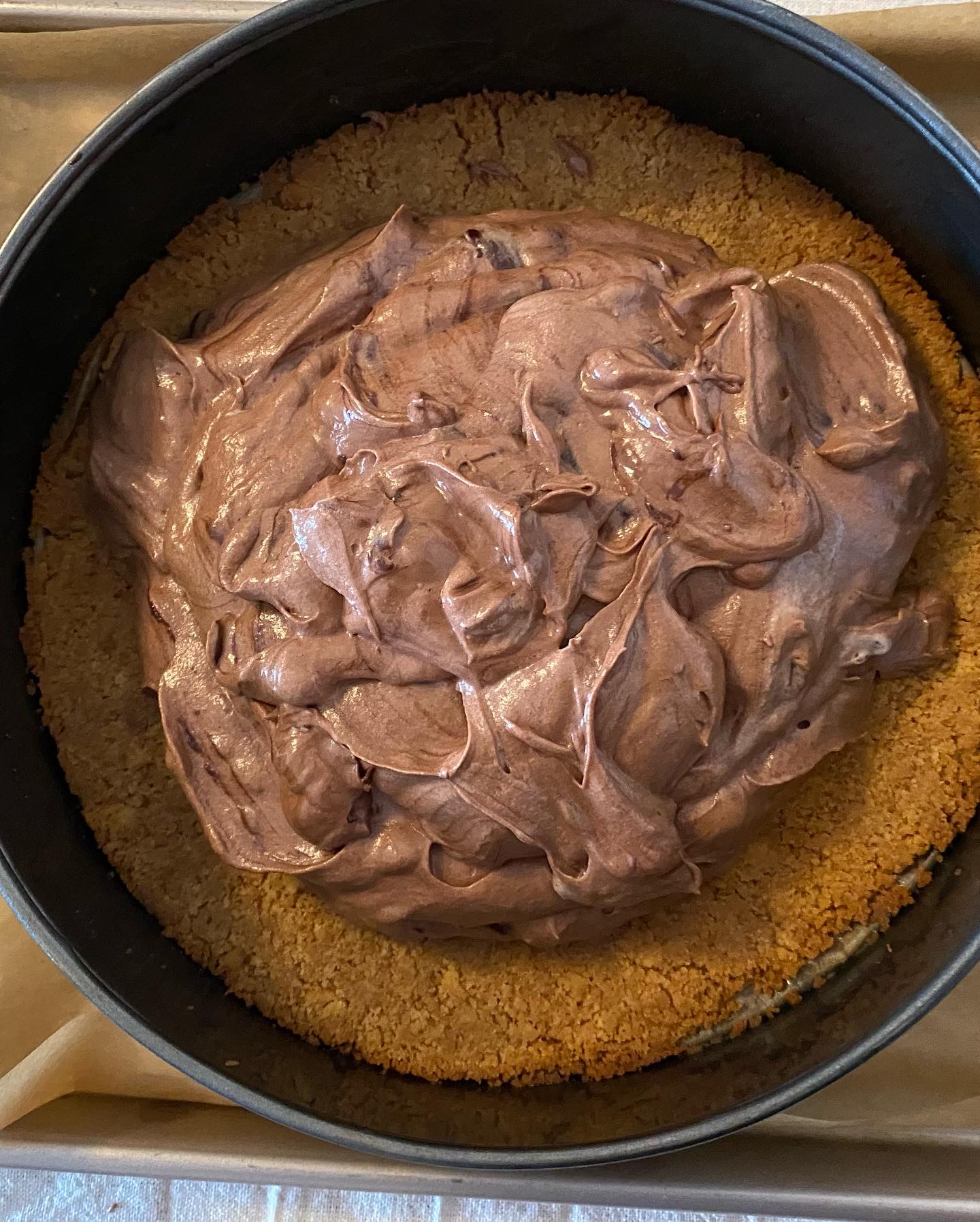 2)- une fois le beurre fondu l’incorporer a la poudre de biscuit, mélanger le tout a l’aide d’une spatule, une fois le mélange homogène verser le tout dans un moule a charnière avec au fond du papier sulfuriser au fond du moule.
