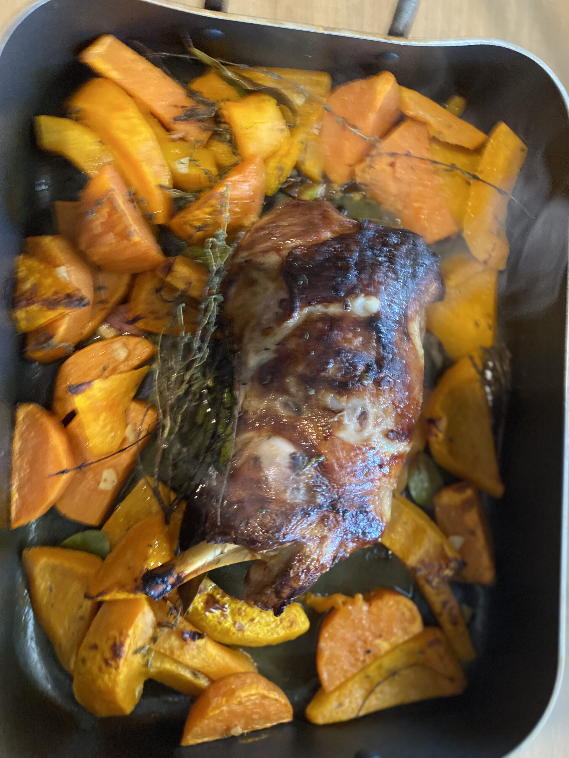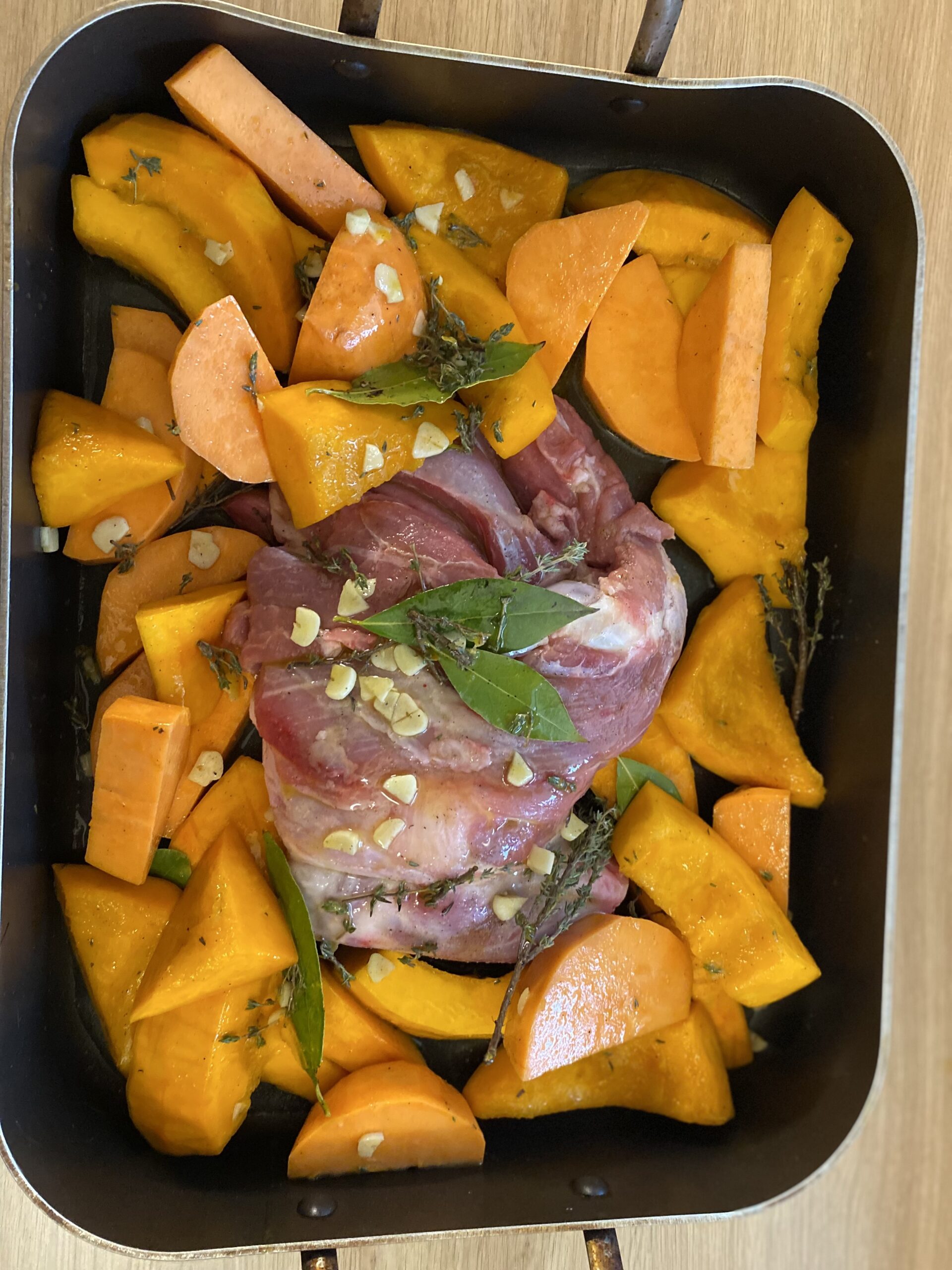 dans le plat , disposez du thyms , le laurier; l’ail en chemise ,salée poivrée