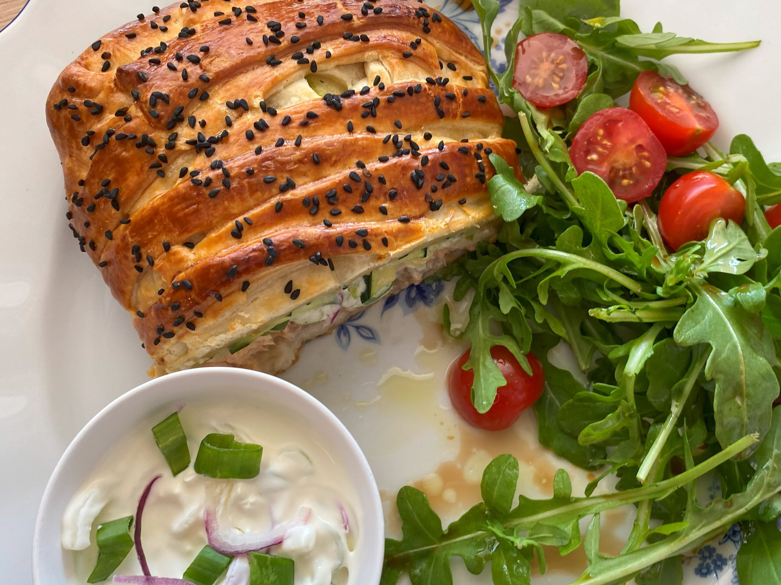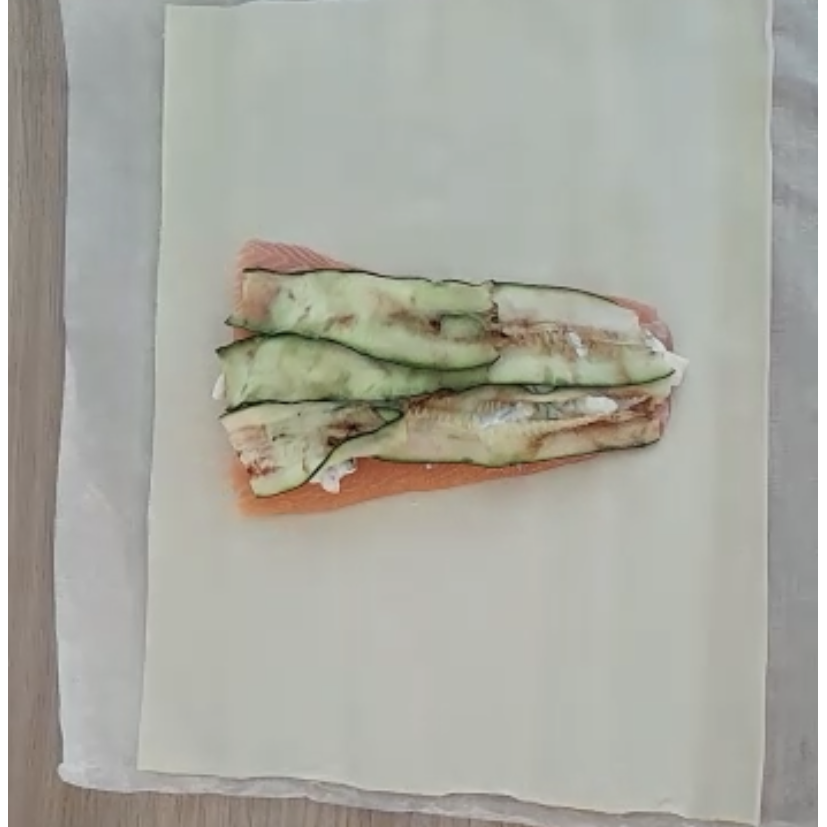 Sur le plan de travail , déroulez la pâte feuilleté et y déposez le saumon au centre , éalisez au couteau les bandes de feuilles , déposez la sauce sur toute la surface , et recouvrir de lamelles de courgette