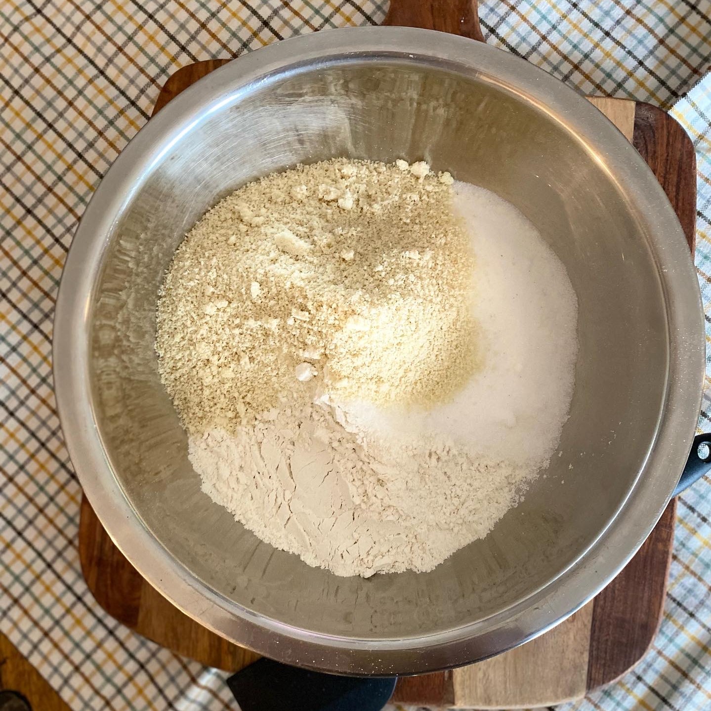 Versez tous les ingrédients secs : le sucre semoule, la poudre d’amandes, et le beurre en dés dans un cul de poule et mélangez le tout à l’aide d’une Maryse