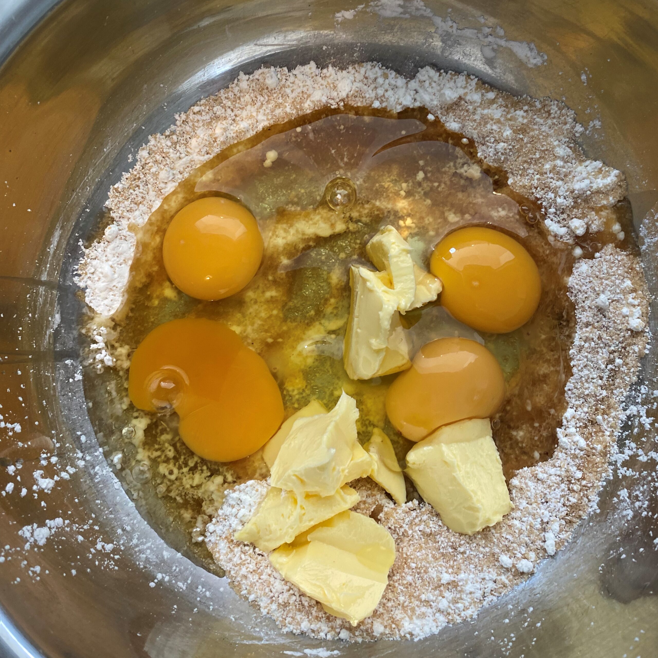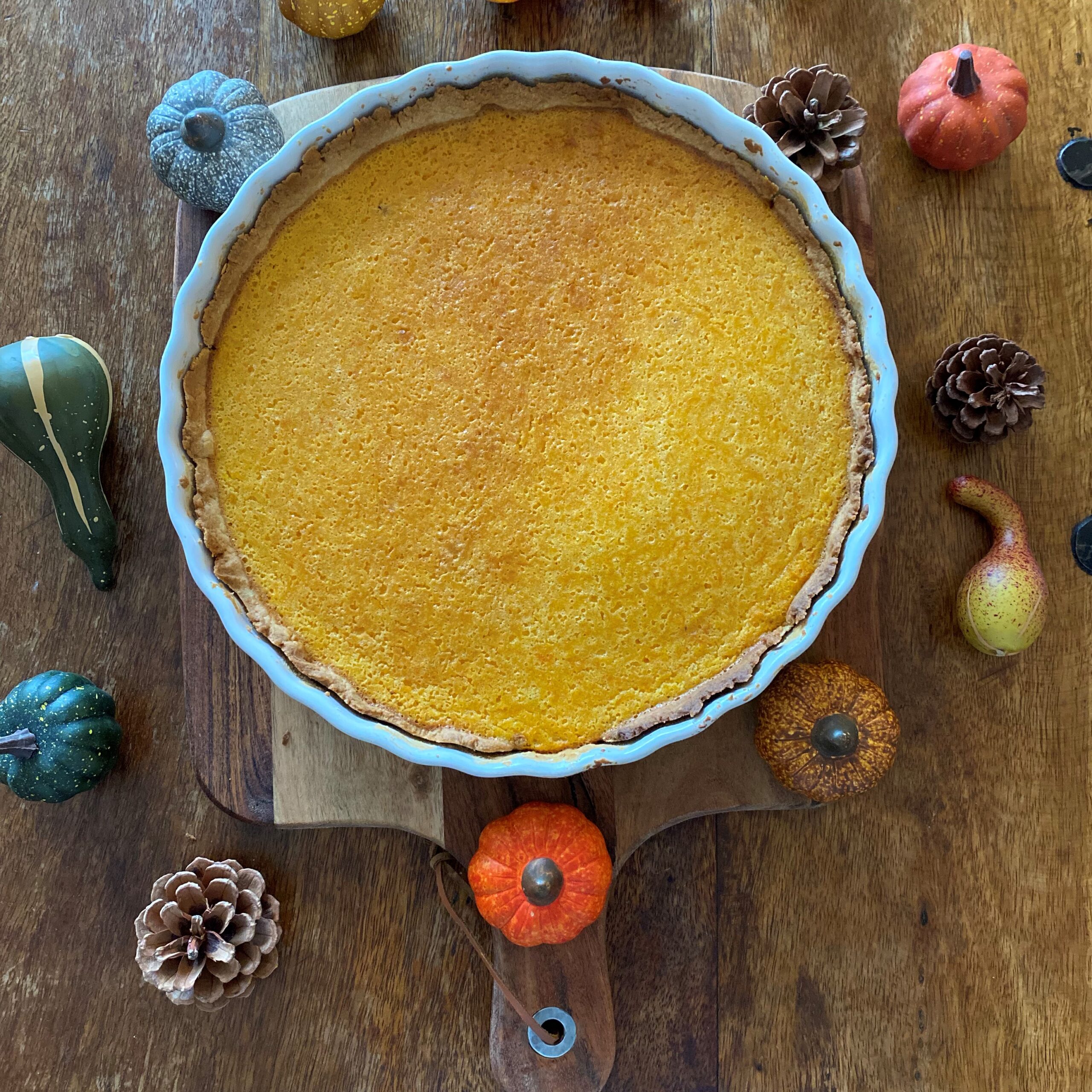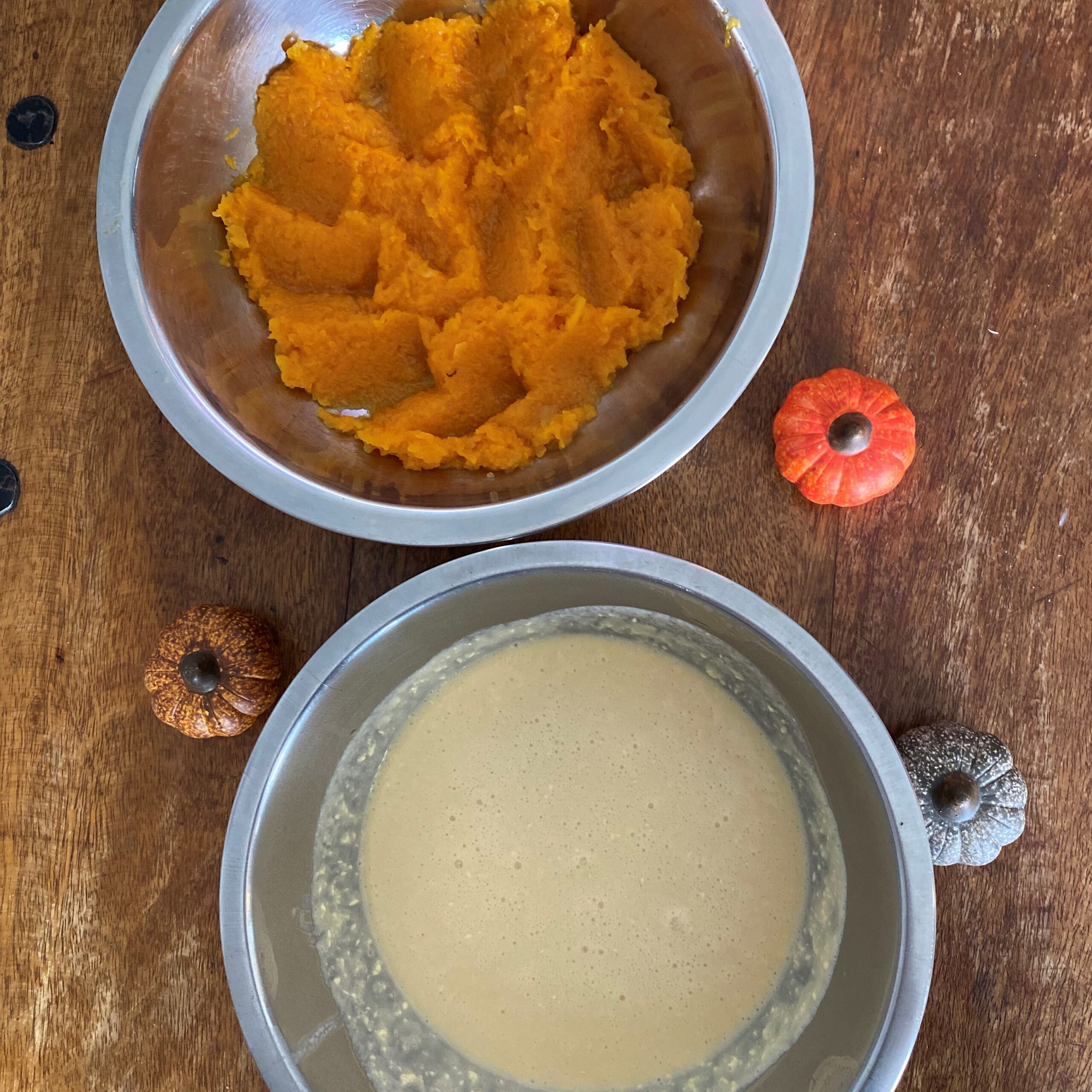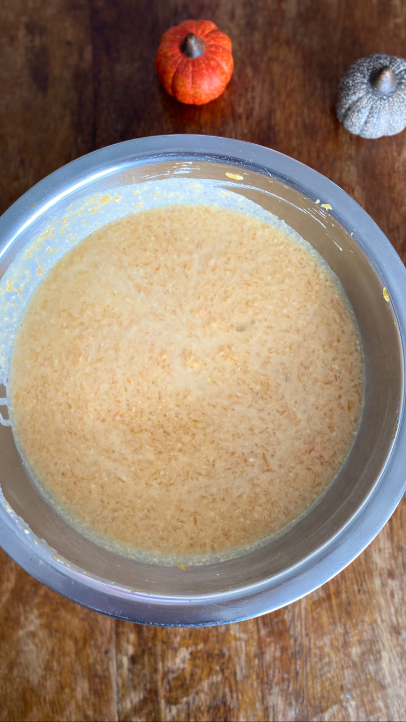 -Mélangez la farine et le sucre roux dans un saladier, ajoutez successivement les œufs et la crème en fouettant vivement, puis incorporez la purée de potiron, la cannelle et mélangez le tout,