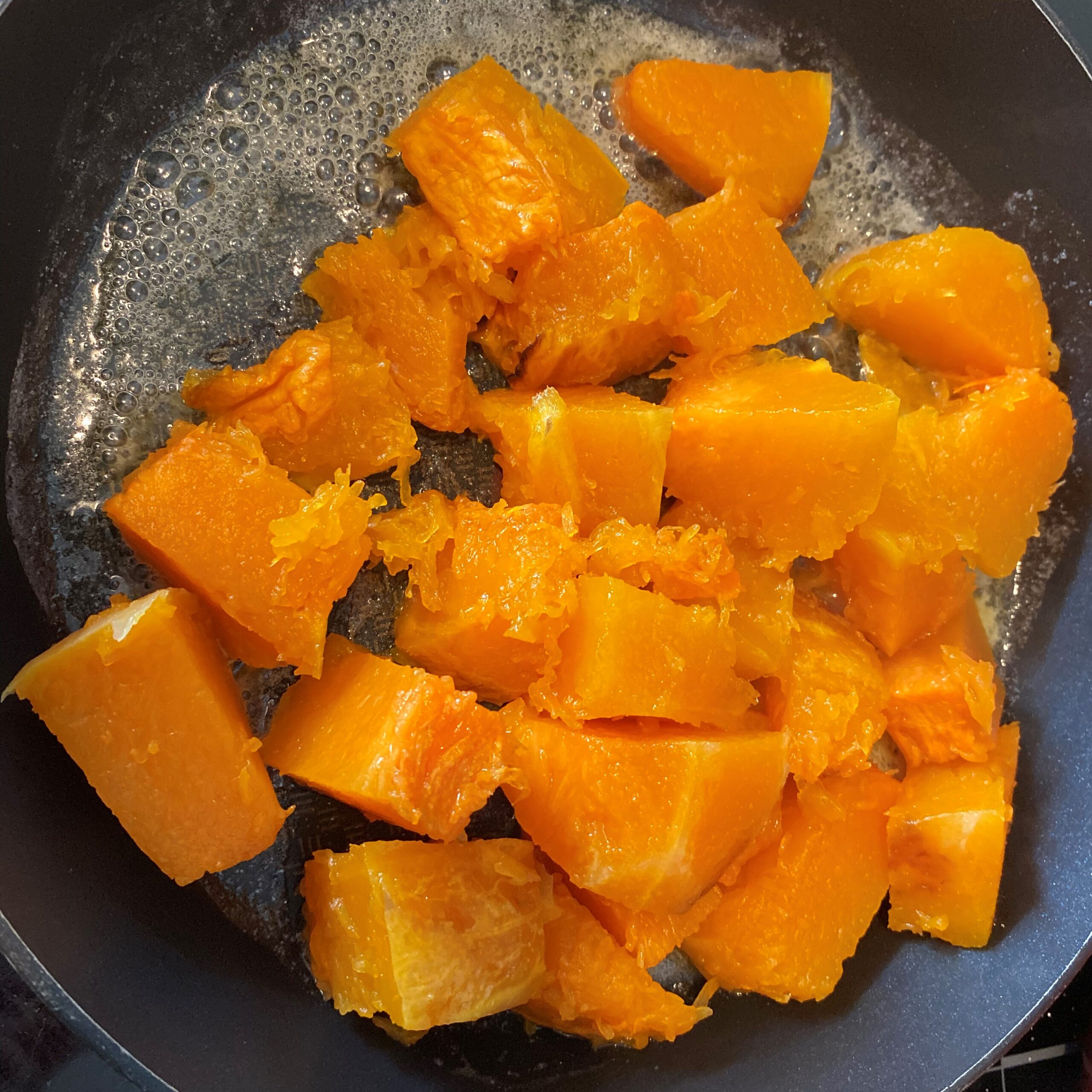 -Faites fondre le beurre dans une poêle et mettez-Sy les cubes de potiron à revenir 10 minutes à feu moyen, jusqu’à ce que tout leur eau de végétation soit évaporée et qu’ils s’écrasent facilement.