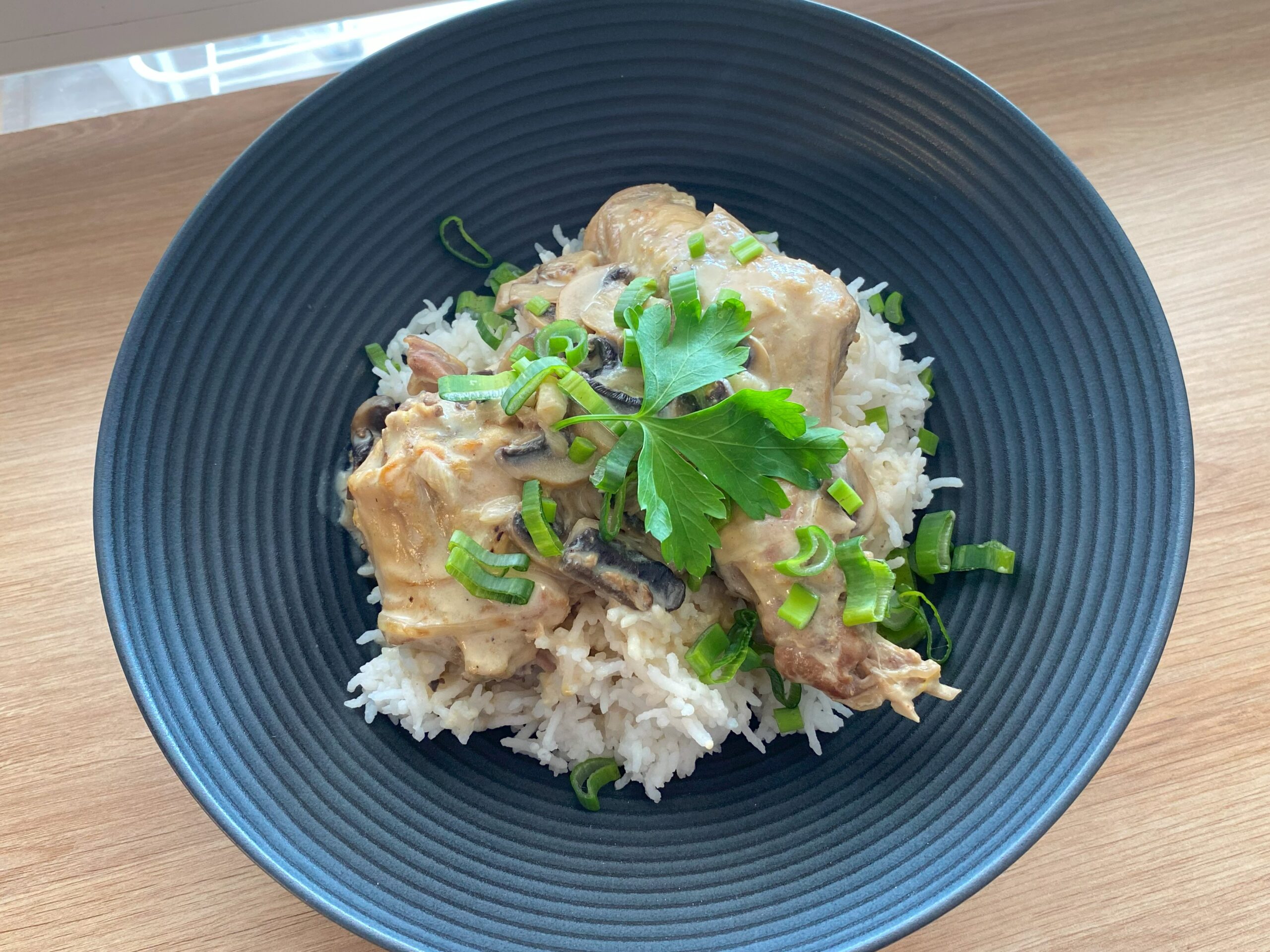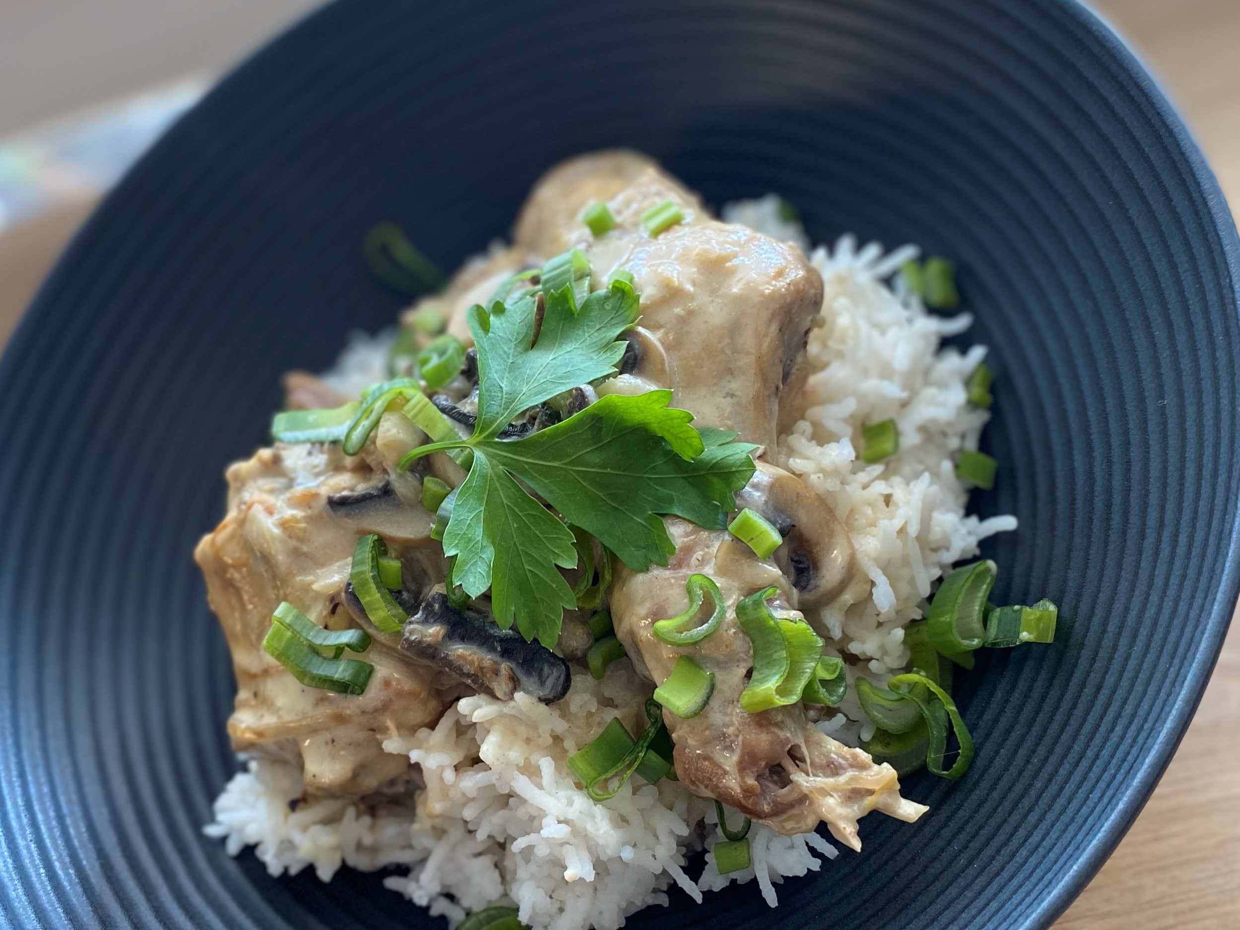 Passez au dressage , dans une assiette creuse déposez le riz , la viande la sauce , les hérbes et dégustez .