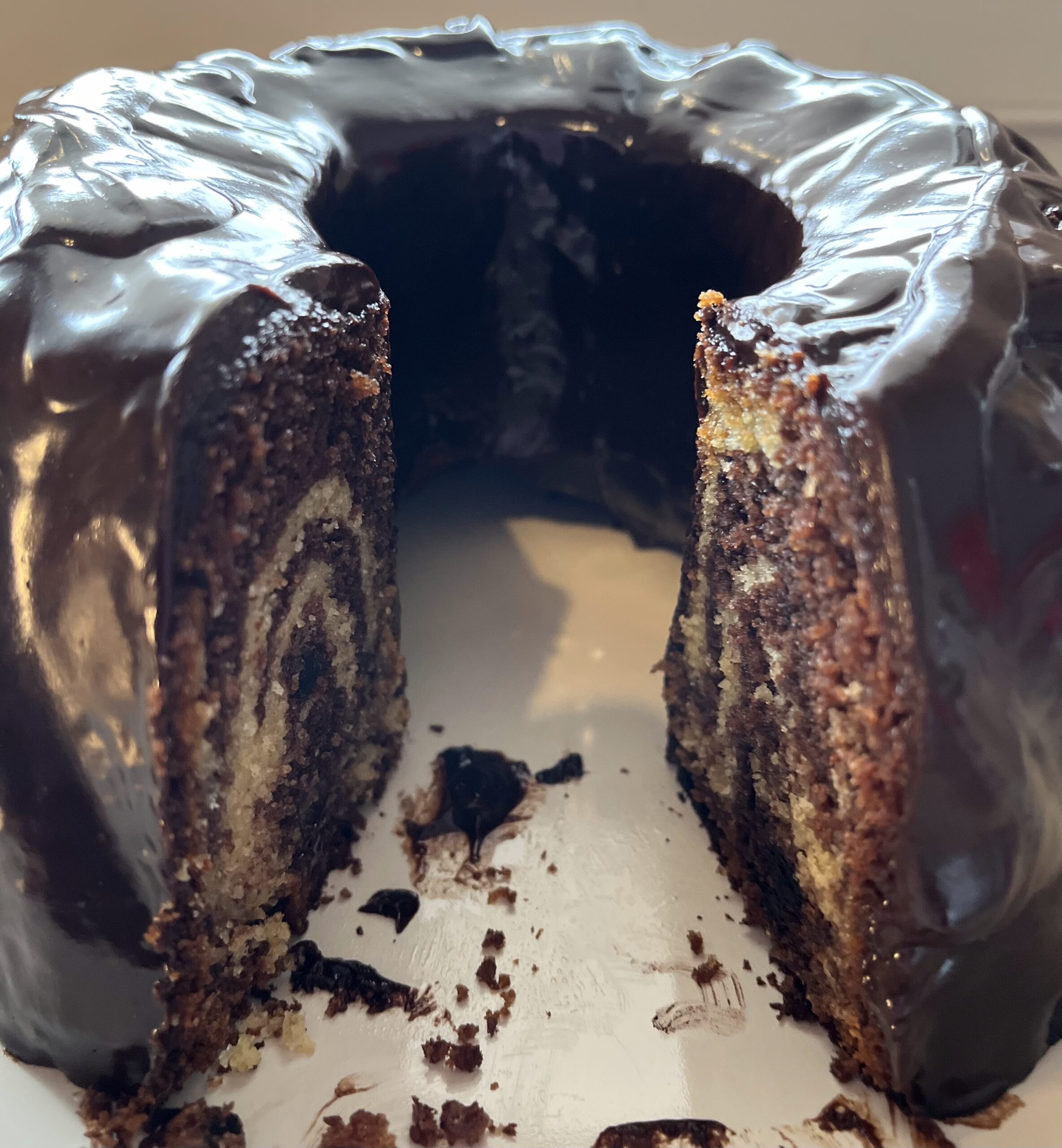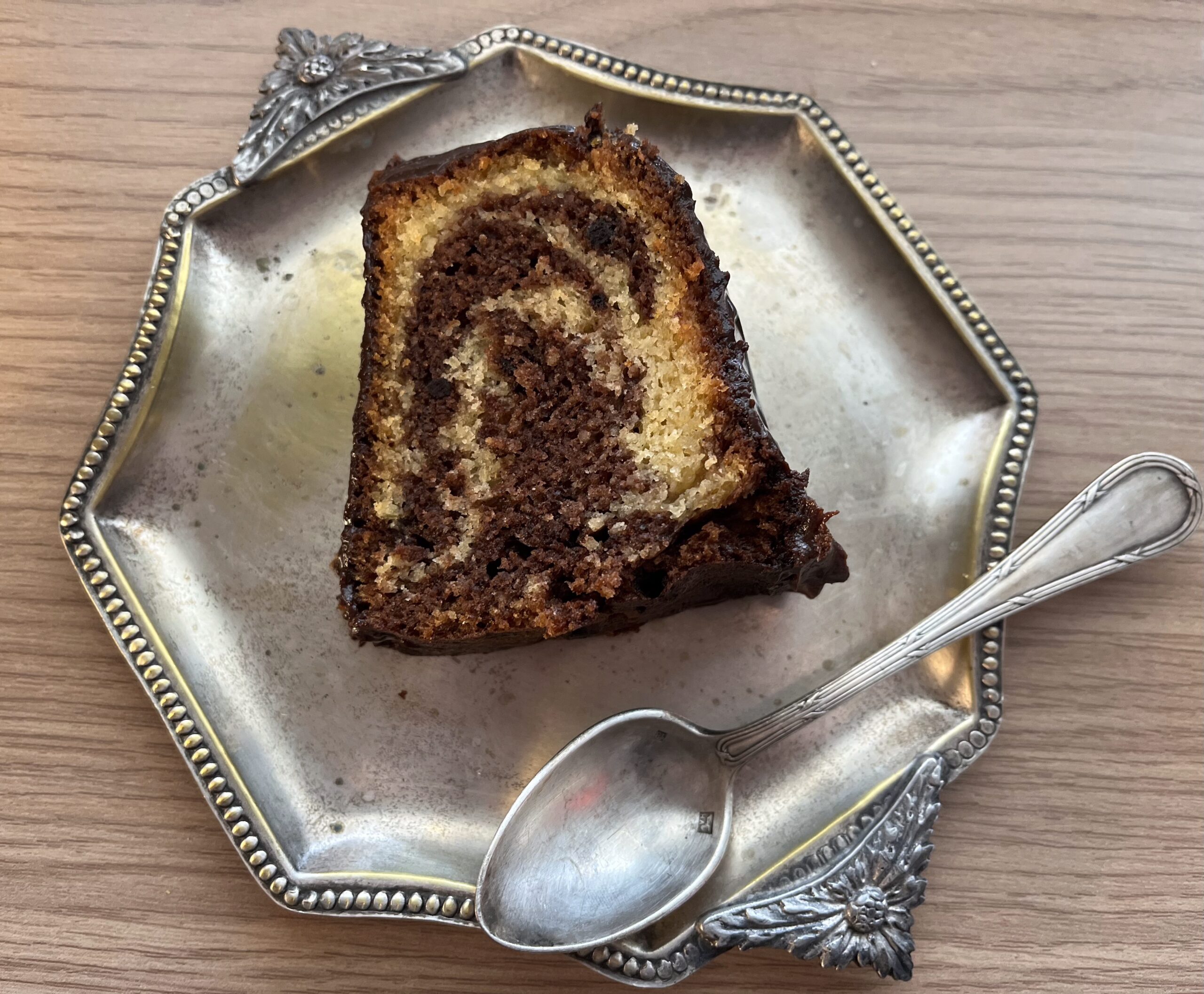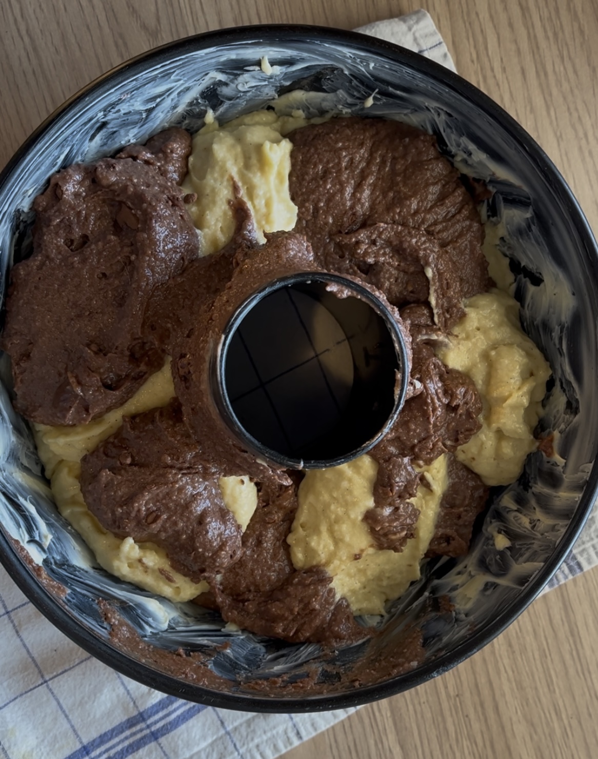 verssez chacune des deux pâte , verssez d’abord une partie de la pâte nature , en suite la pâte au cacao puis répéter l’opération jusqu’à épuisement .