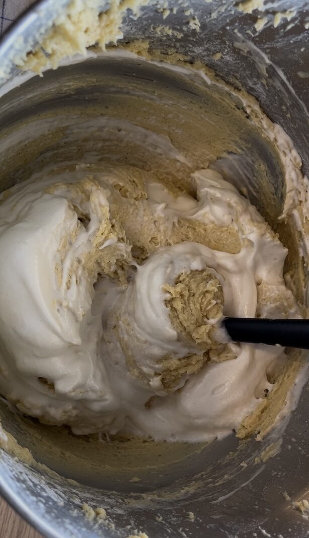 séparez la pâte en deux , incorporer le cacao en poudre délicatement a la maryse de bas en haut ,