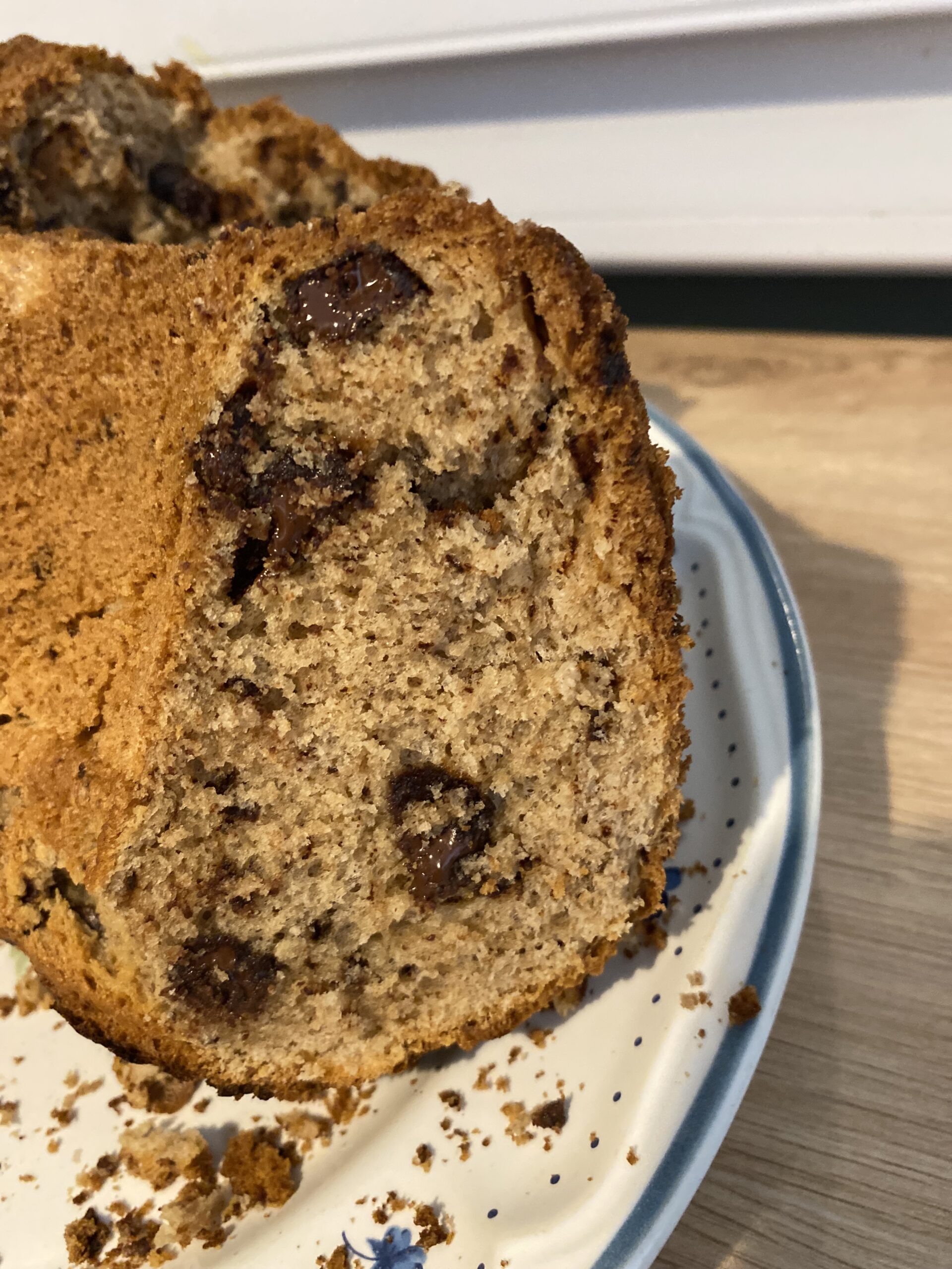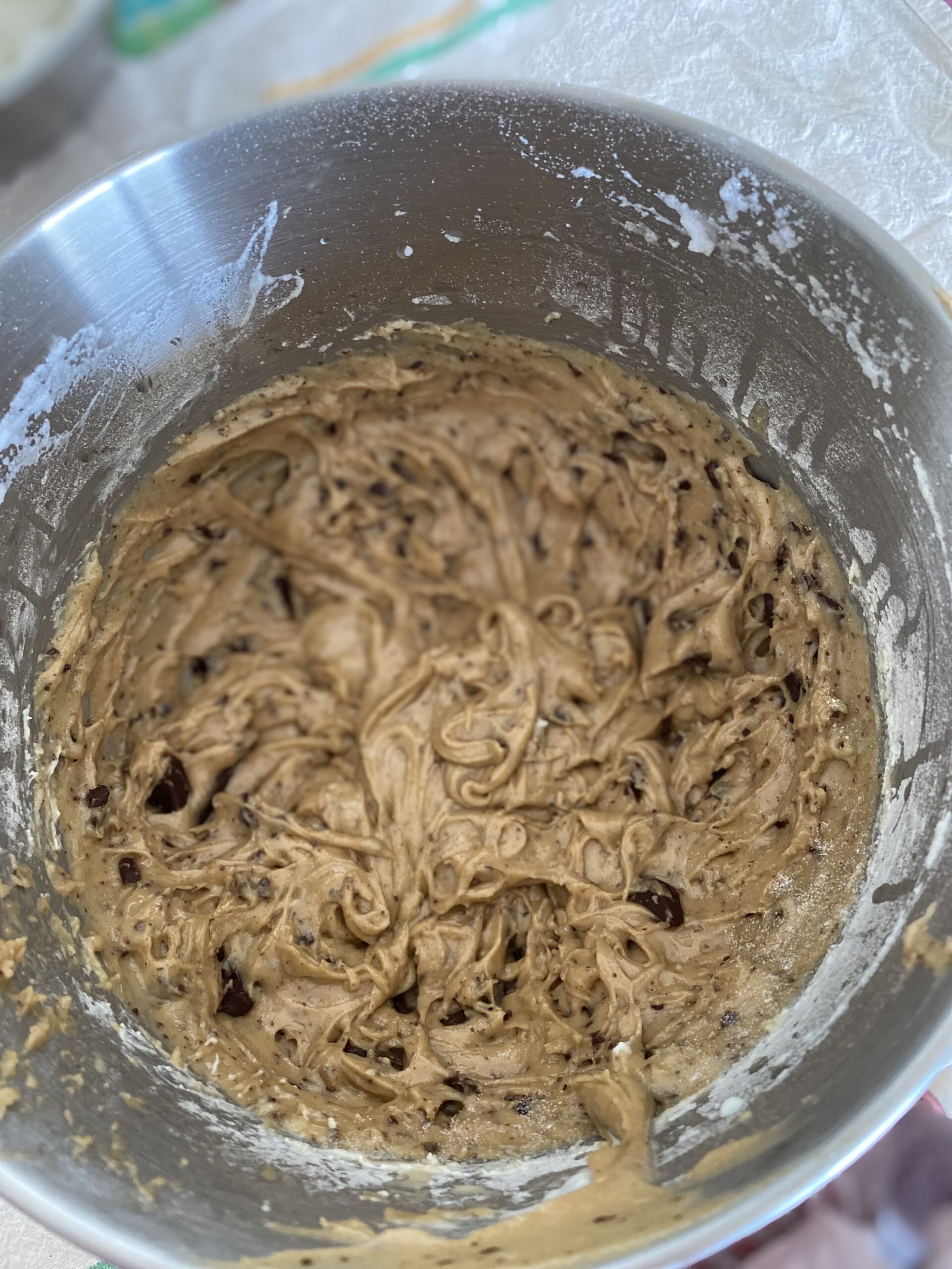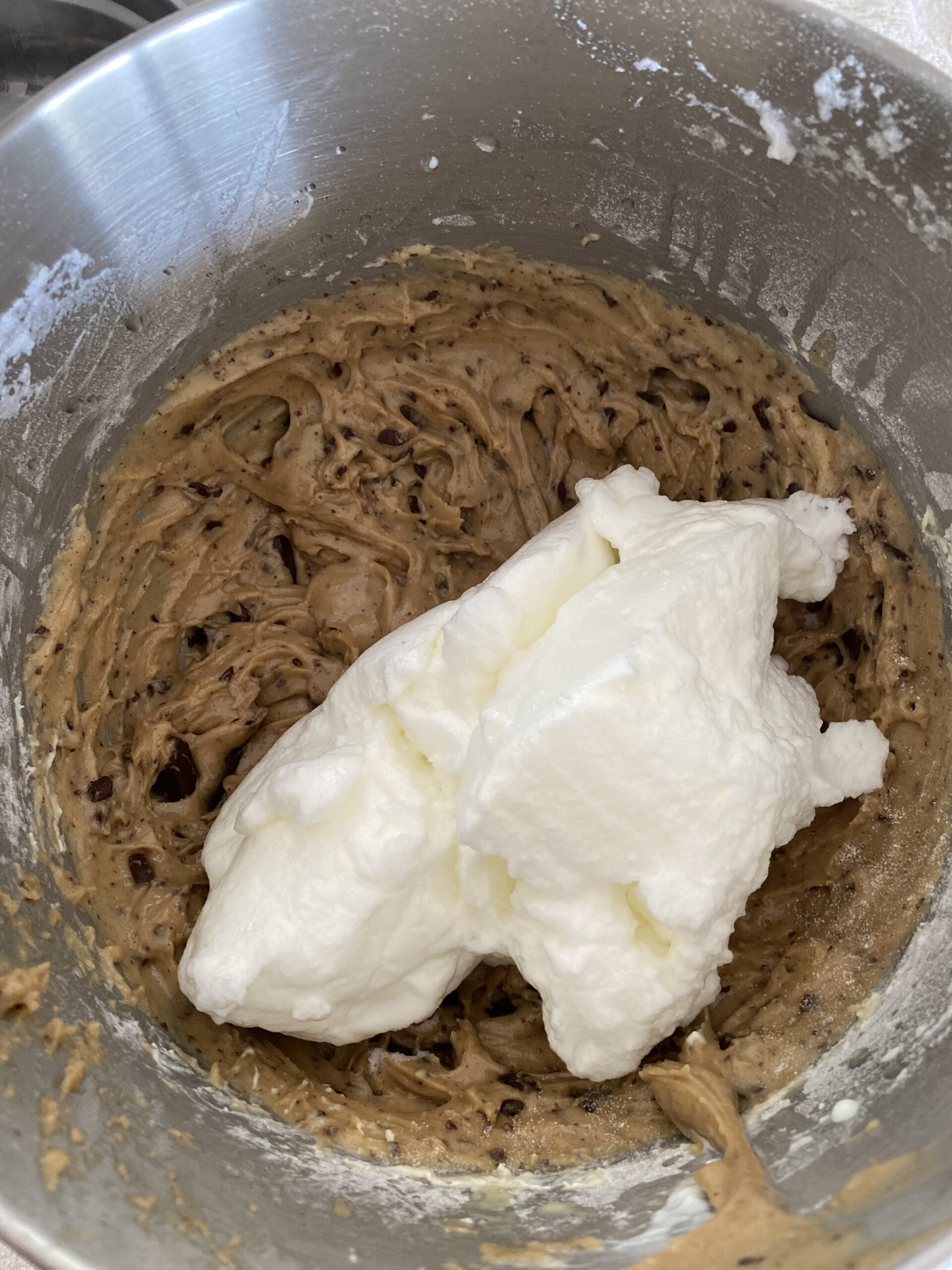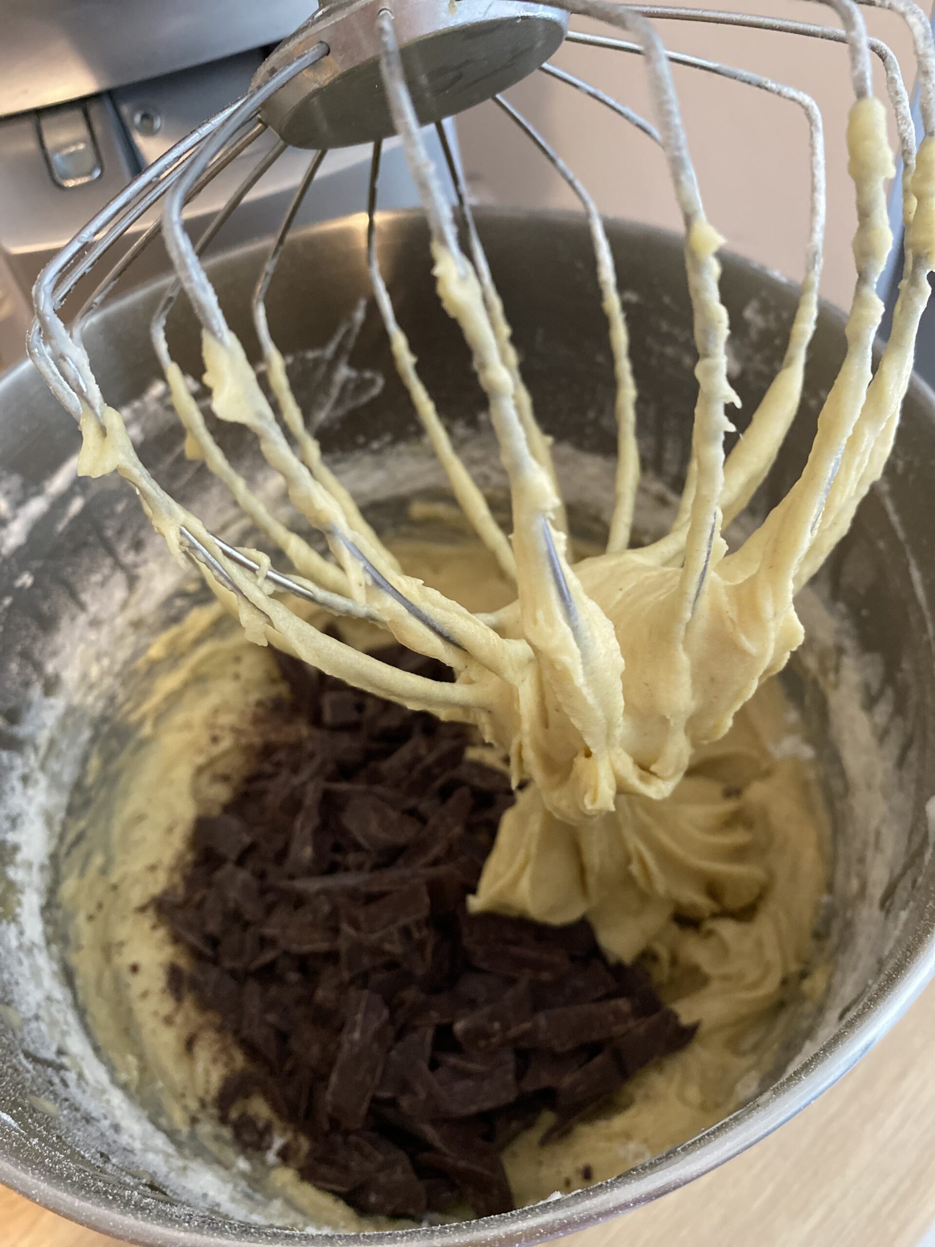 -Tamisez la farine , ajoutez -le au mélange ainsi que la levure chimique , continuez a battre le tout, coupez la tablette de chocolat en gros morceaux a l’aide d’un couteau puis incorporez les au mélange et continuez a battre encore 5 minutes.