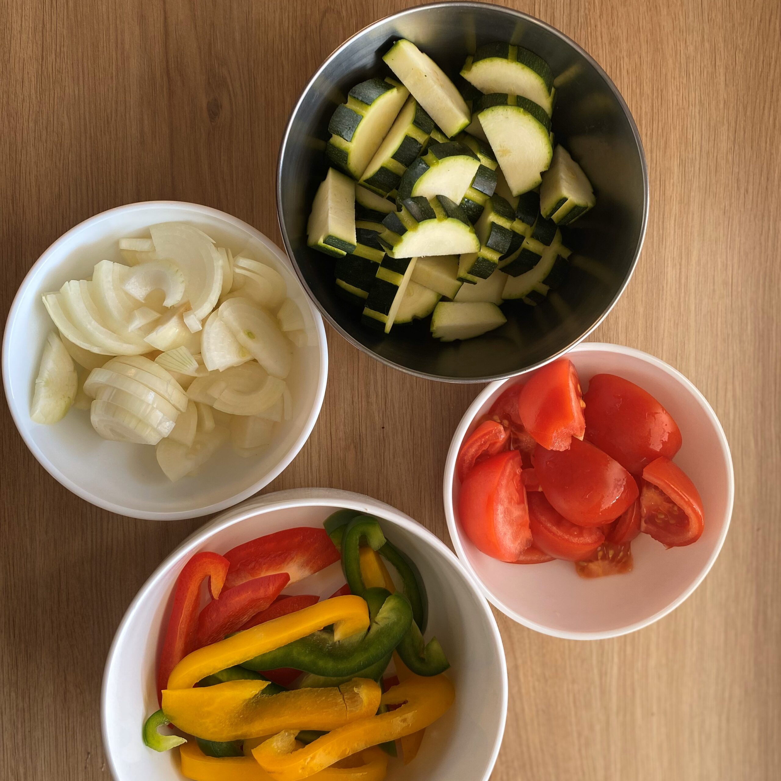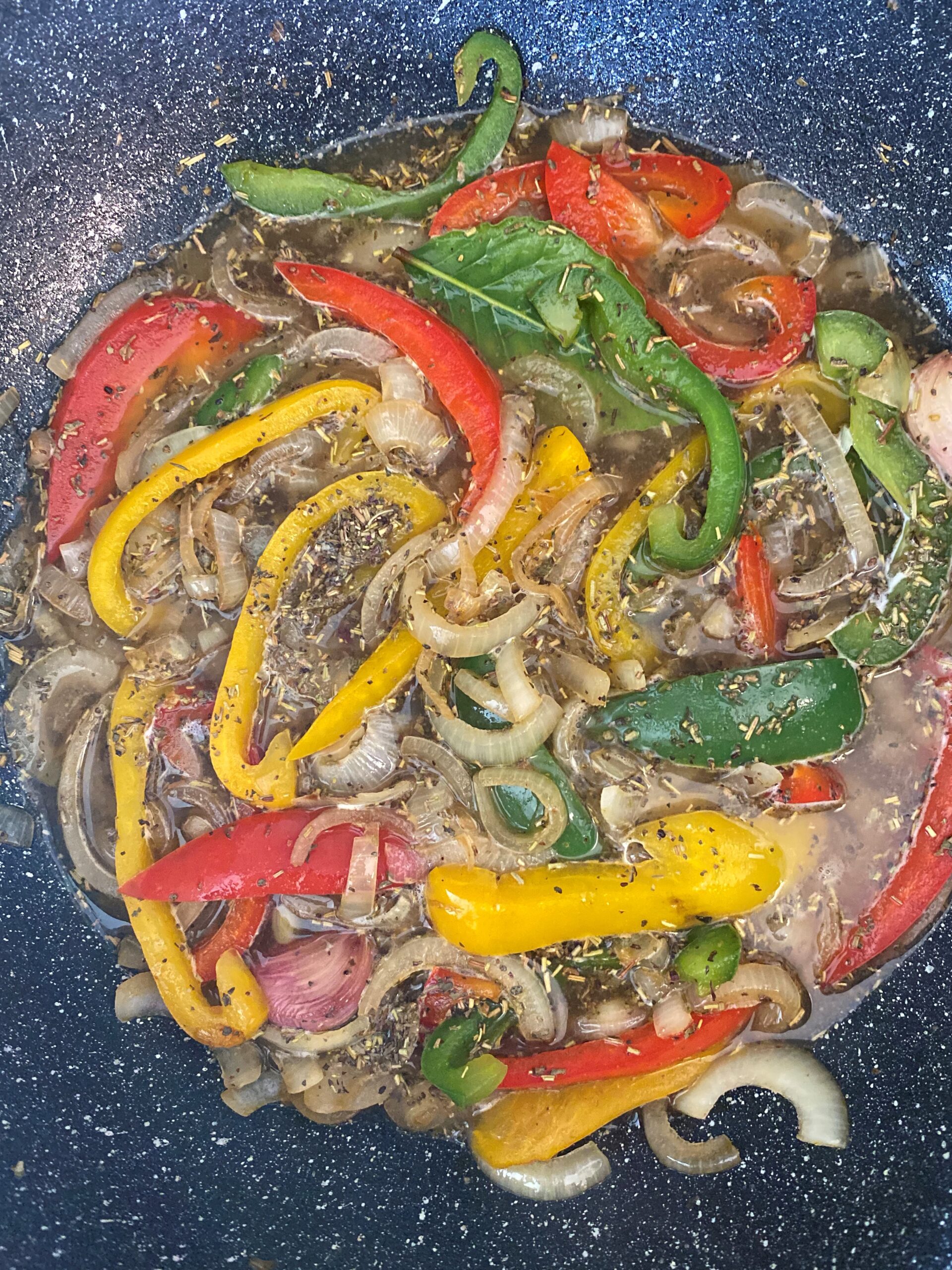 • Faites revenir les oignons , l’ail en chemise , les poivrons quelques minutes