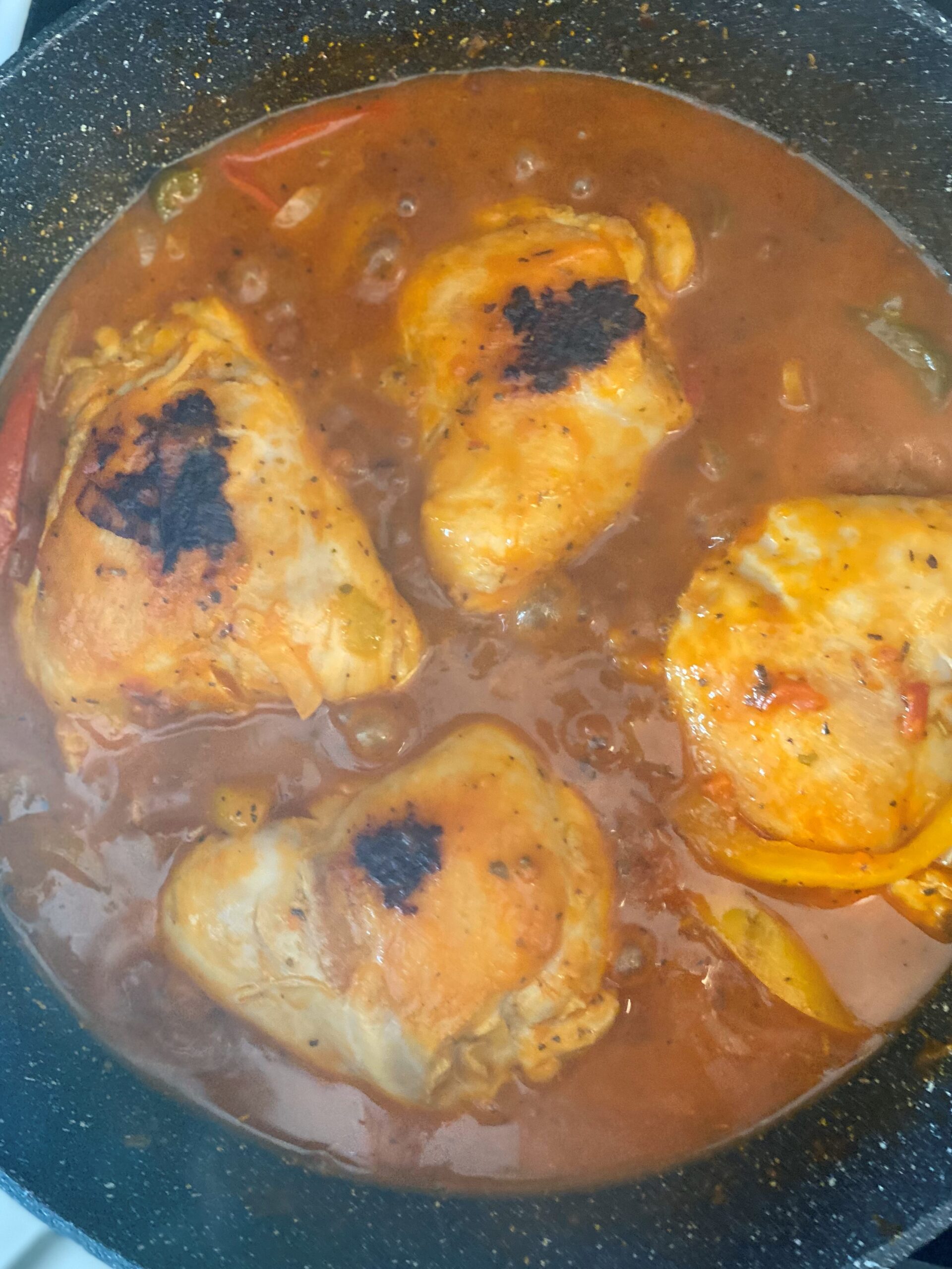 • Ensuite ajoutez le coulis de tomate à la préparation et y déposer les hauts de cuisses et laisser mijoter 20 minutes