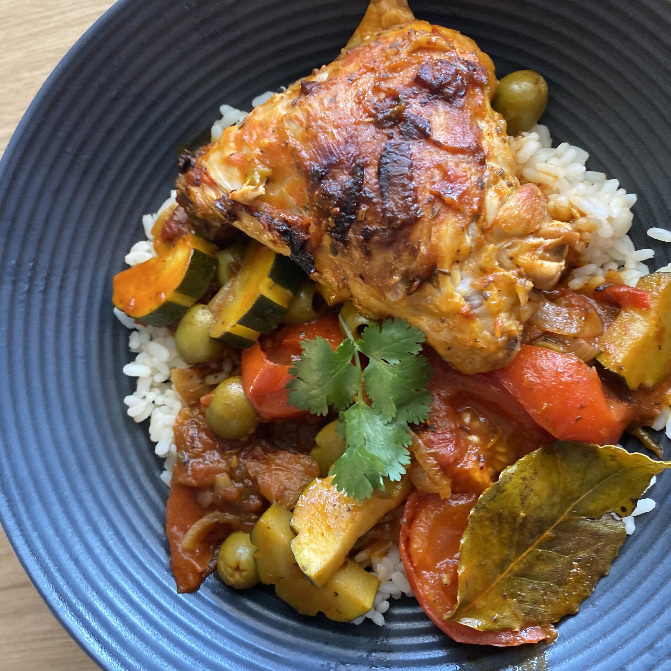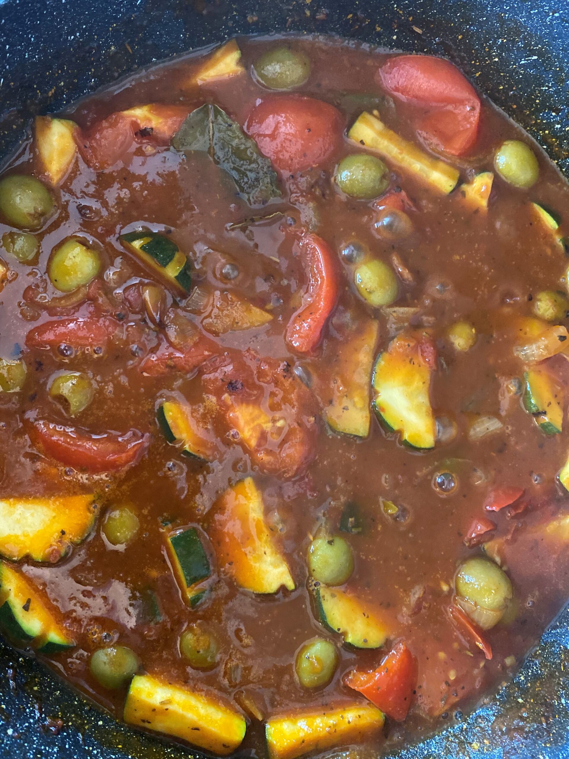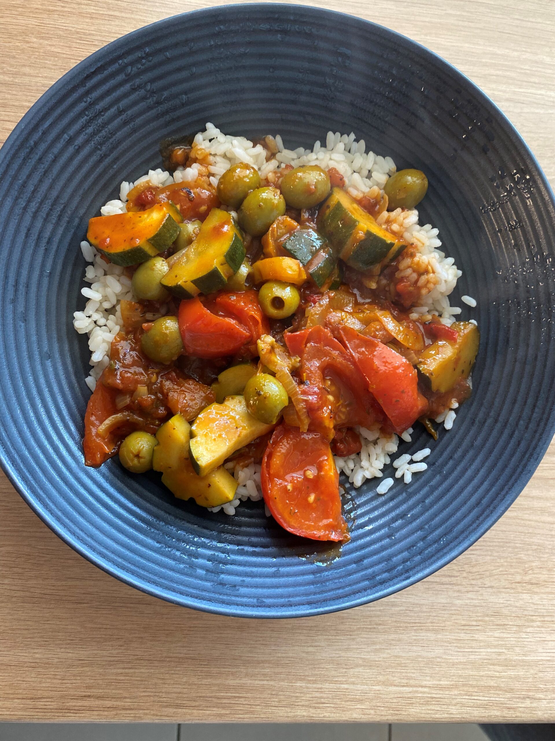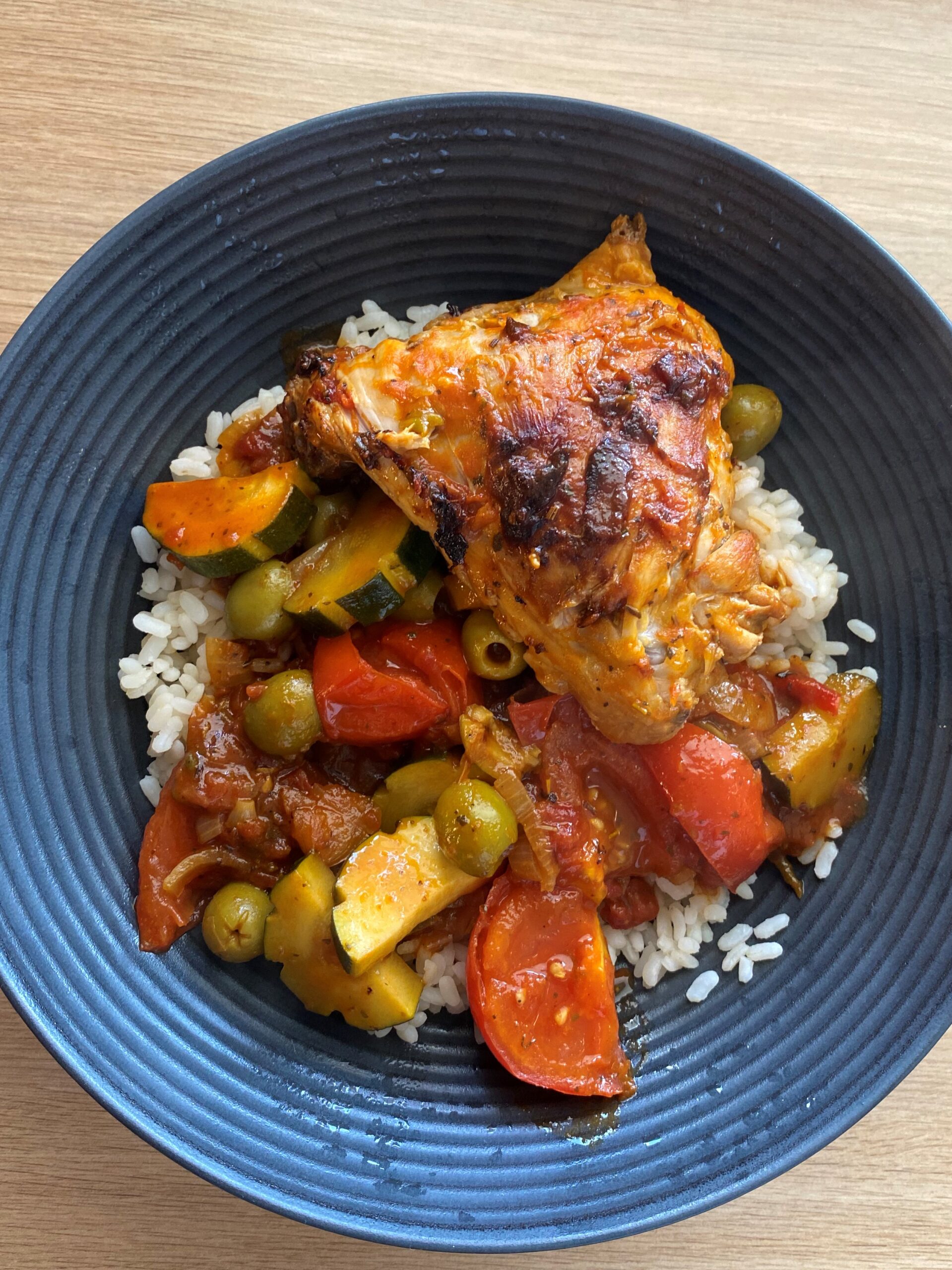 • Retirez le poulet et ajoutez les tomates et les courgettes puis les olives quelques minutes