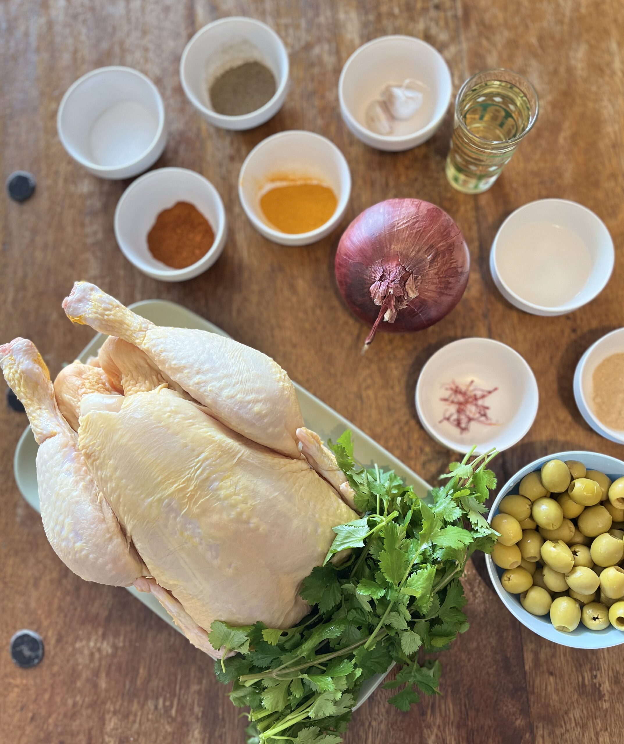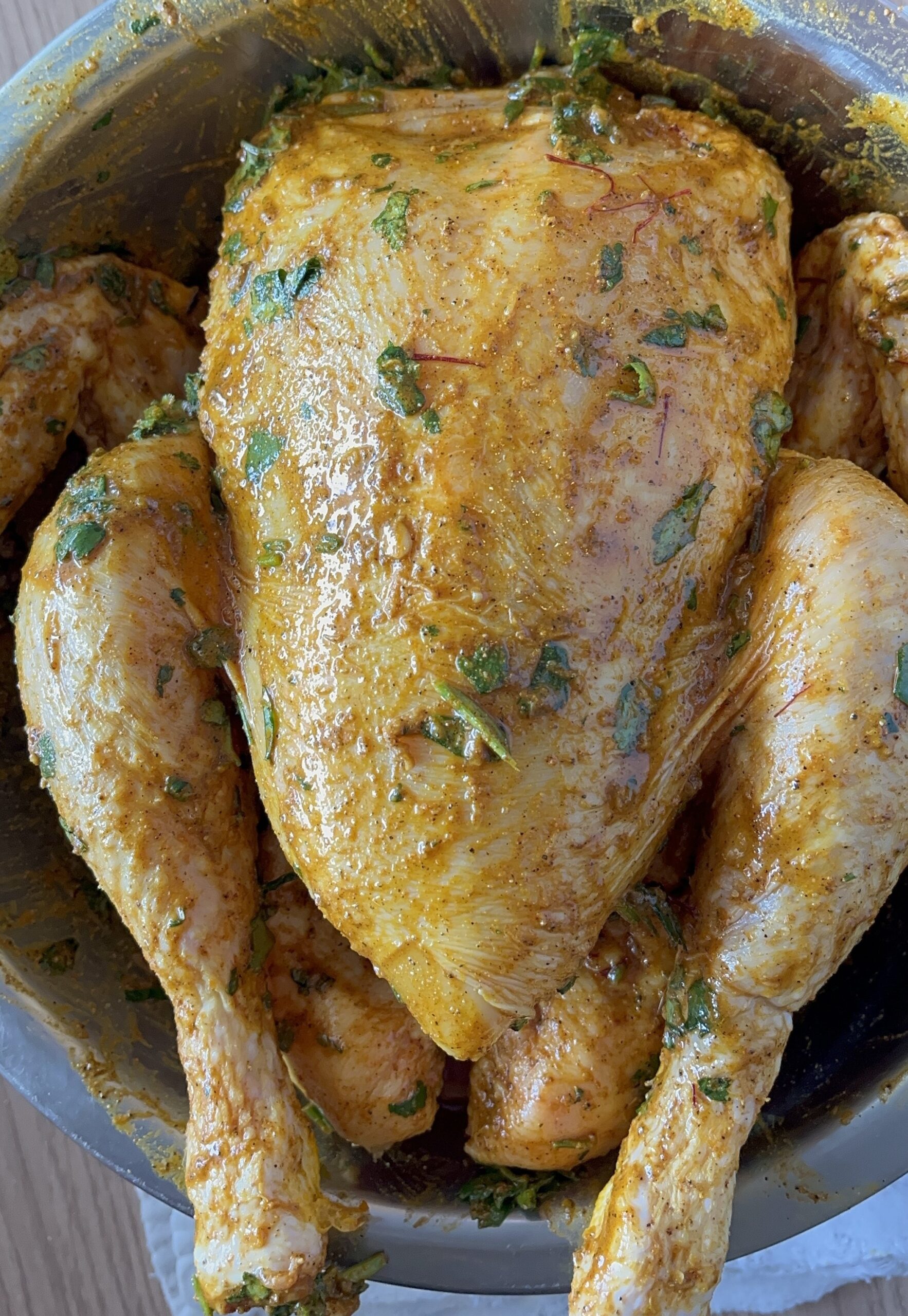 préparez la marinade : achée la coriandre , une partie des oignos acheé , les épices ,sel poivre et huile d’olive mélangez le tout et plongez -si le poulet et impréniez-le de la marinade , couvrez-le et laissez marinez pendnat une heure .