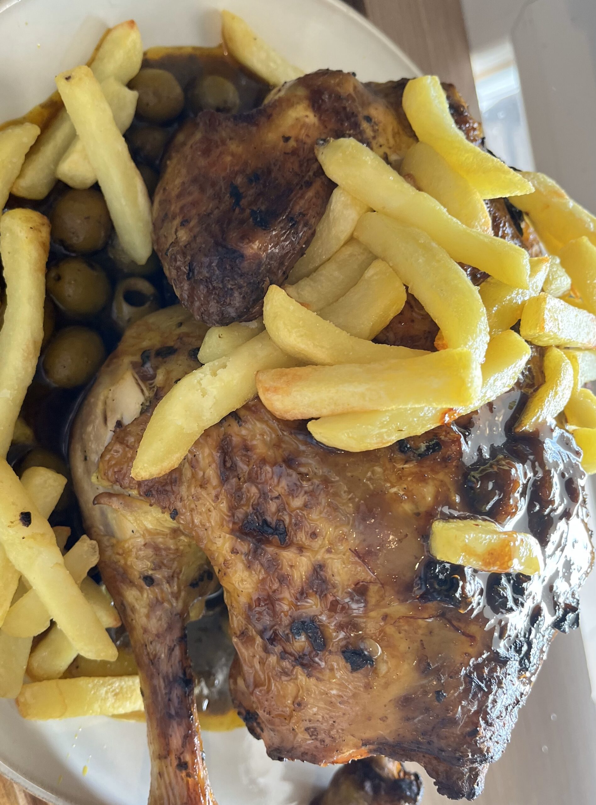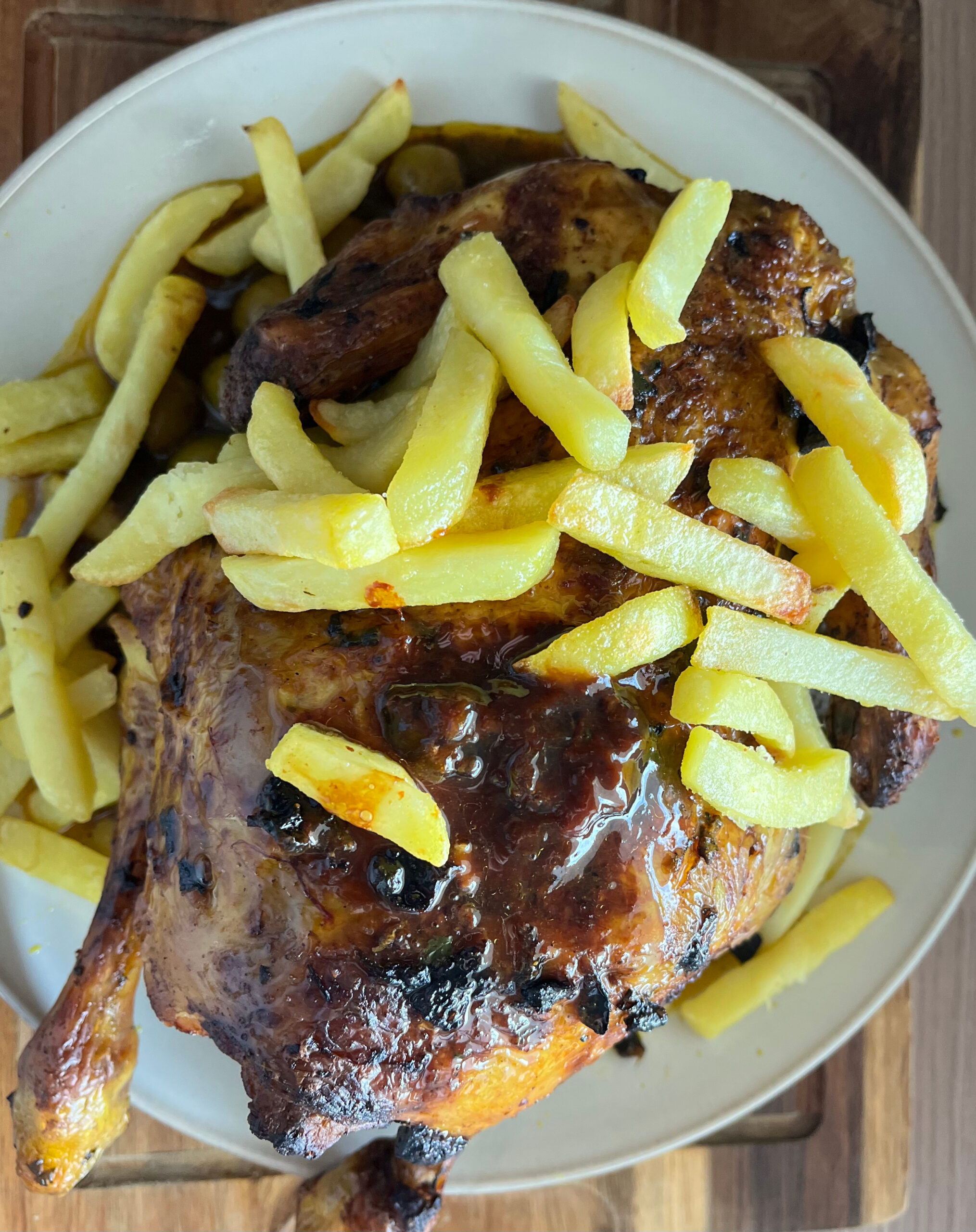 une fois le tout prêt , sotire le poulet du four , verssez la sauce dans le grand plat , puis y disposer le poulet et enfin les frittes sur le dessut .