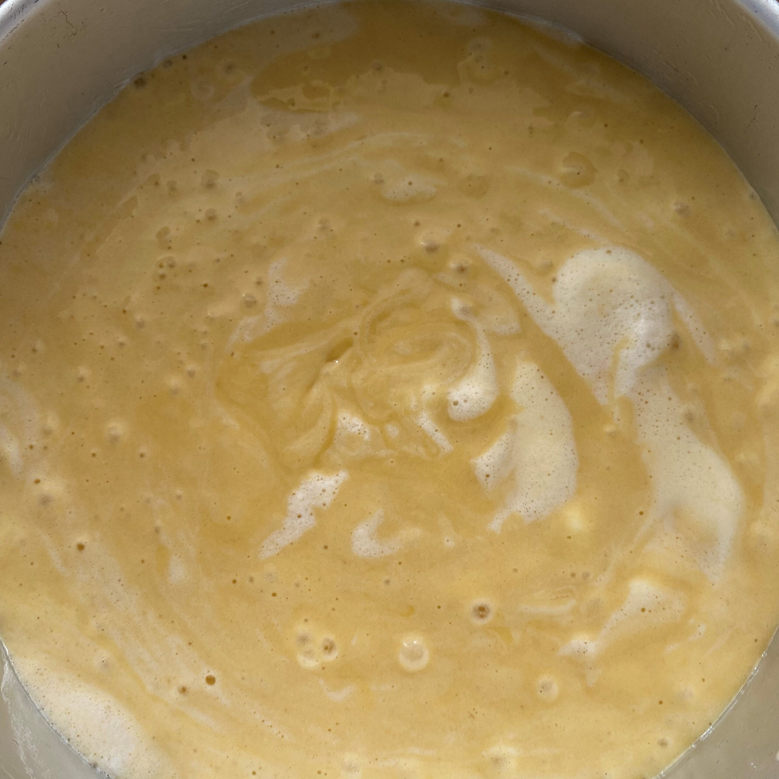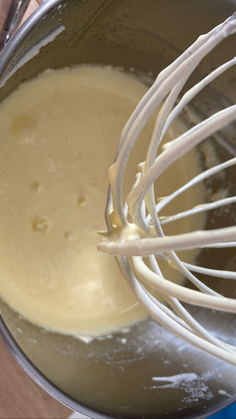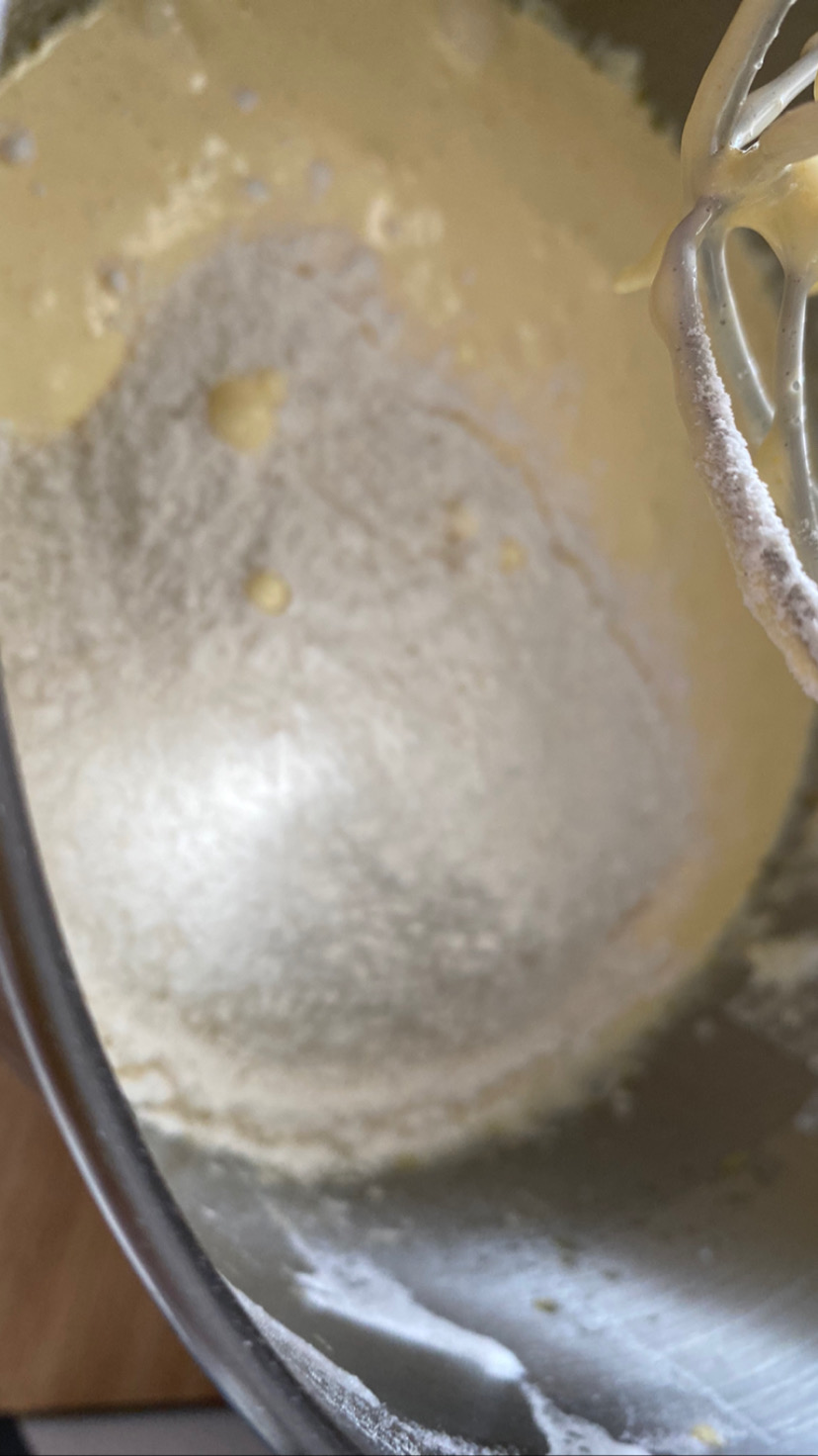 -une fois le beurre fondu incorporez-le au mélange tout en continuant à battre au batteur, puis ajoutez la farine en une fois et laissez battre encore jusqu’à obtenir un mélange homogène