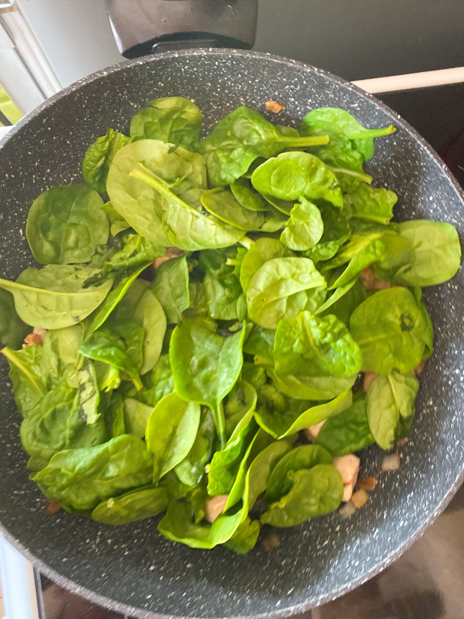 Remuez le poulet de temps en temps et y ajoutez les pouces d’épinard