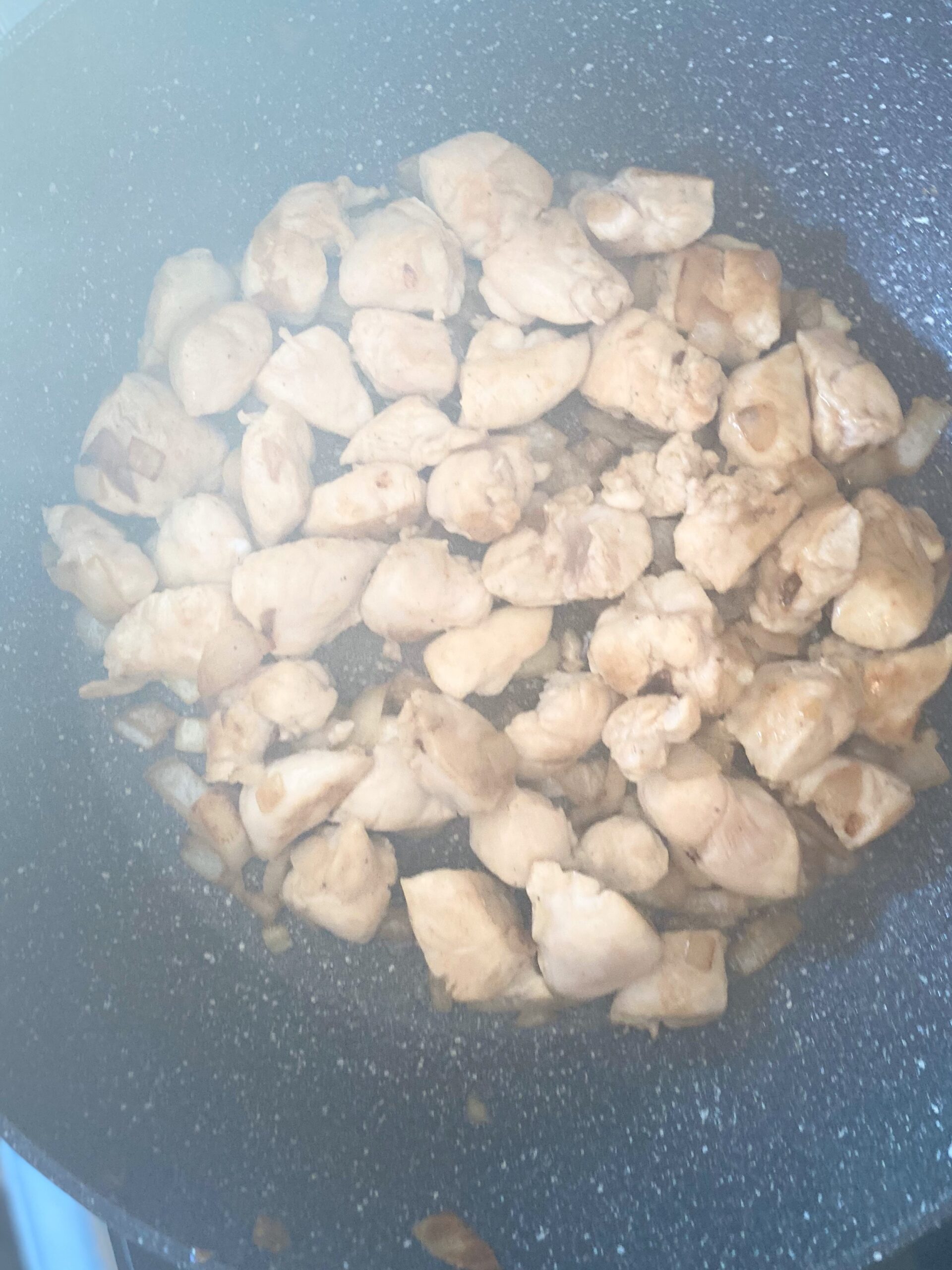 Puis y ajoutez les morceaux de poulet , et les faires cuire pendant 5 minutes ensemble