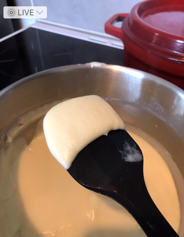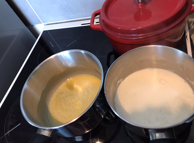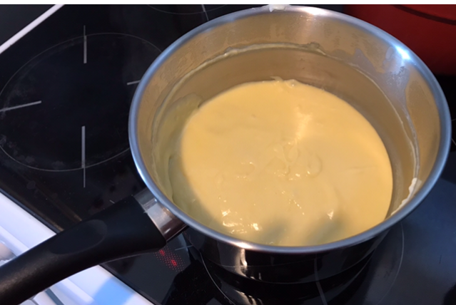 4-Lorsque le mélange est lisse retirez du feu et versez le lait chaud doucement tout en continuant à fouettez régulièrement