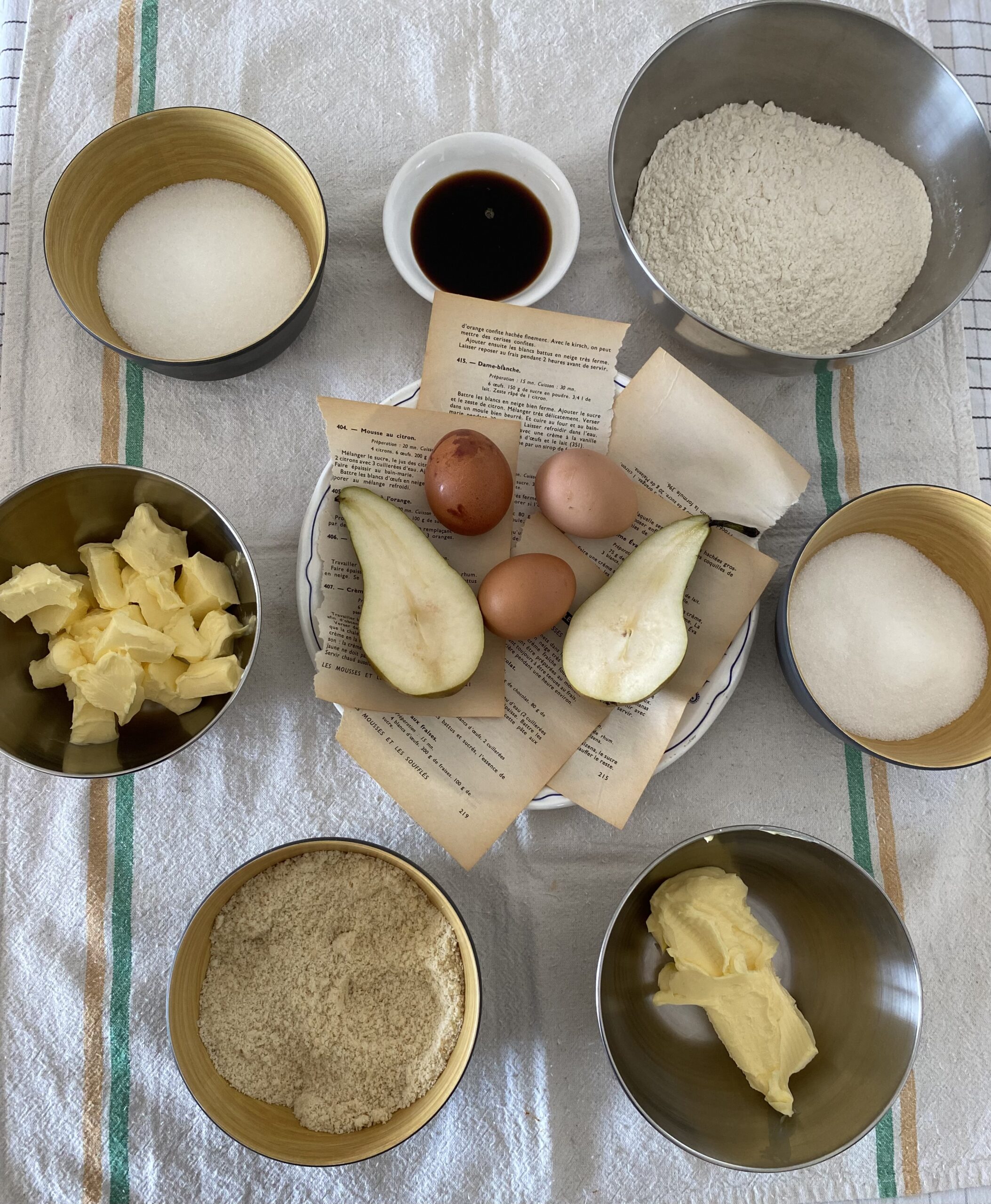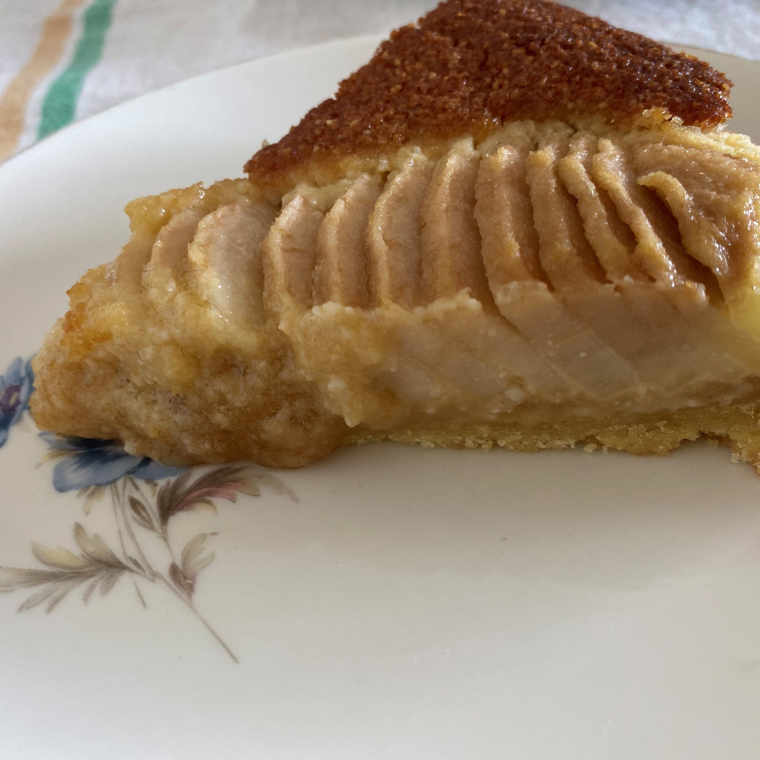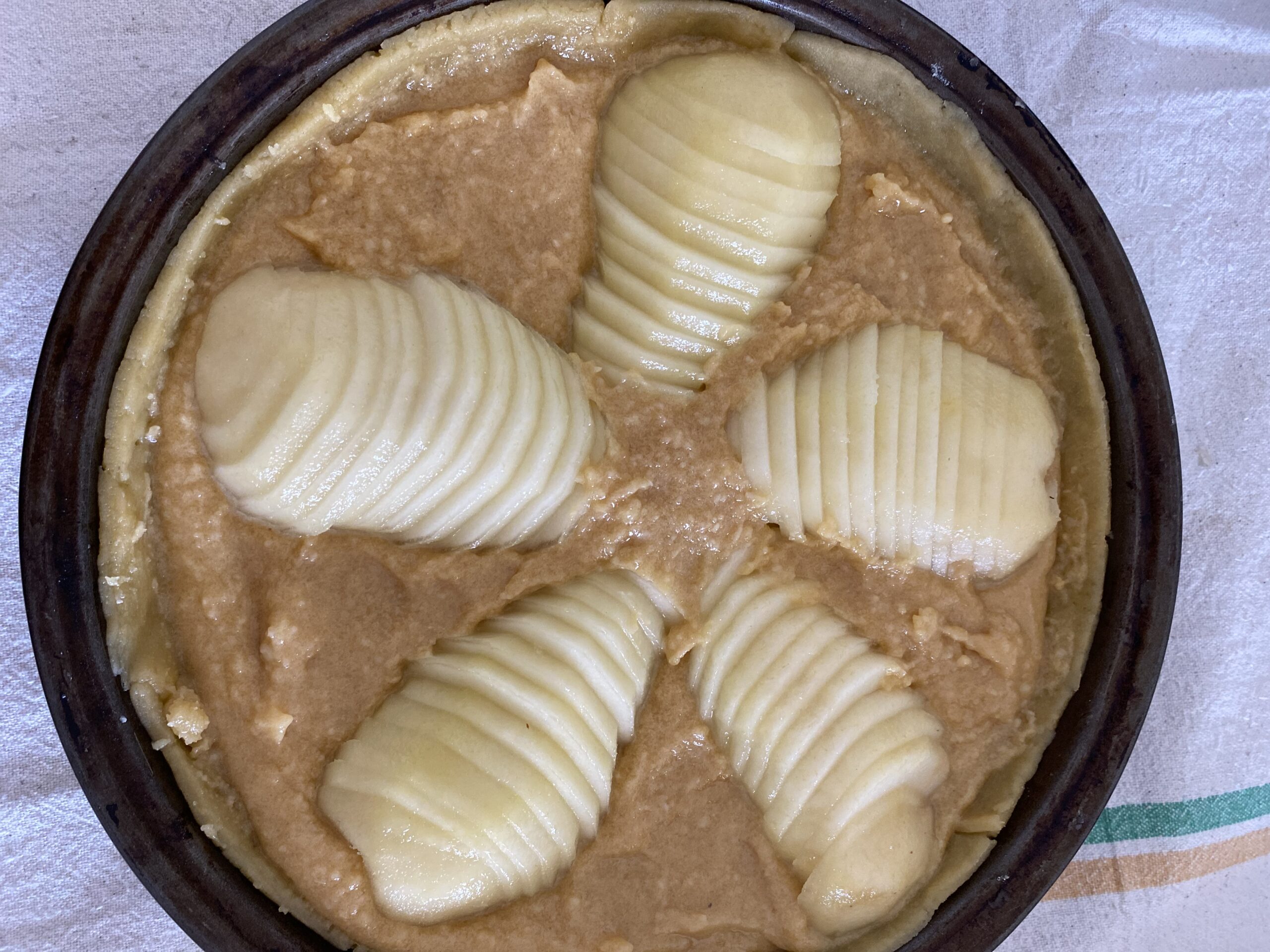 – garnissez de la frangipane puis coupez les poires en lamelles et disposez –les sur la frangipane en biais.
