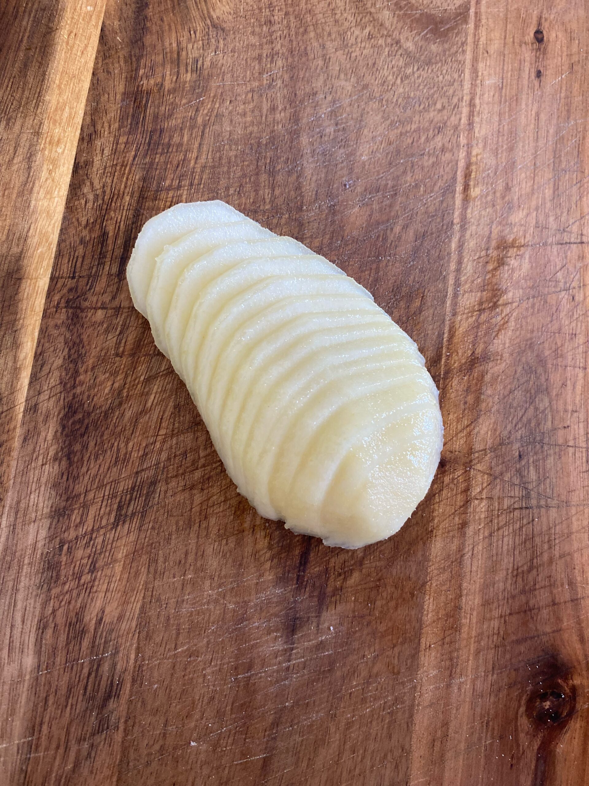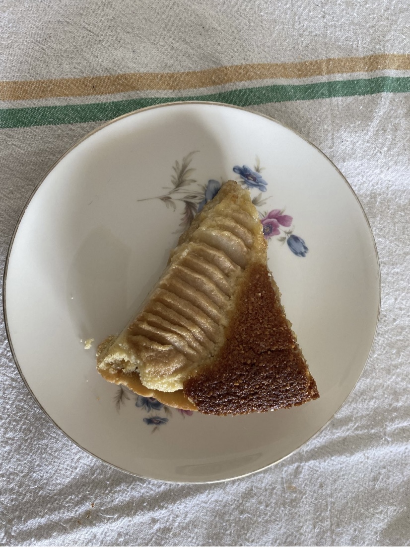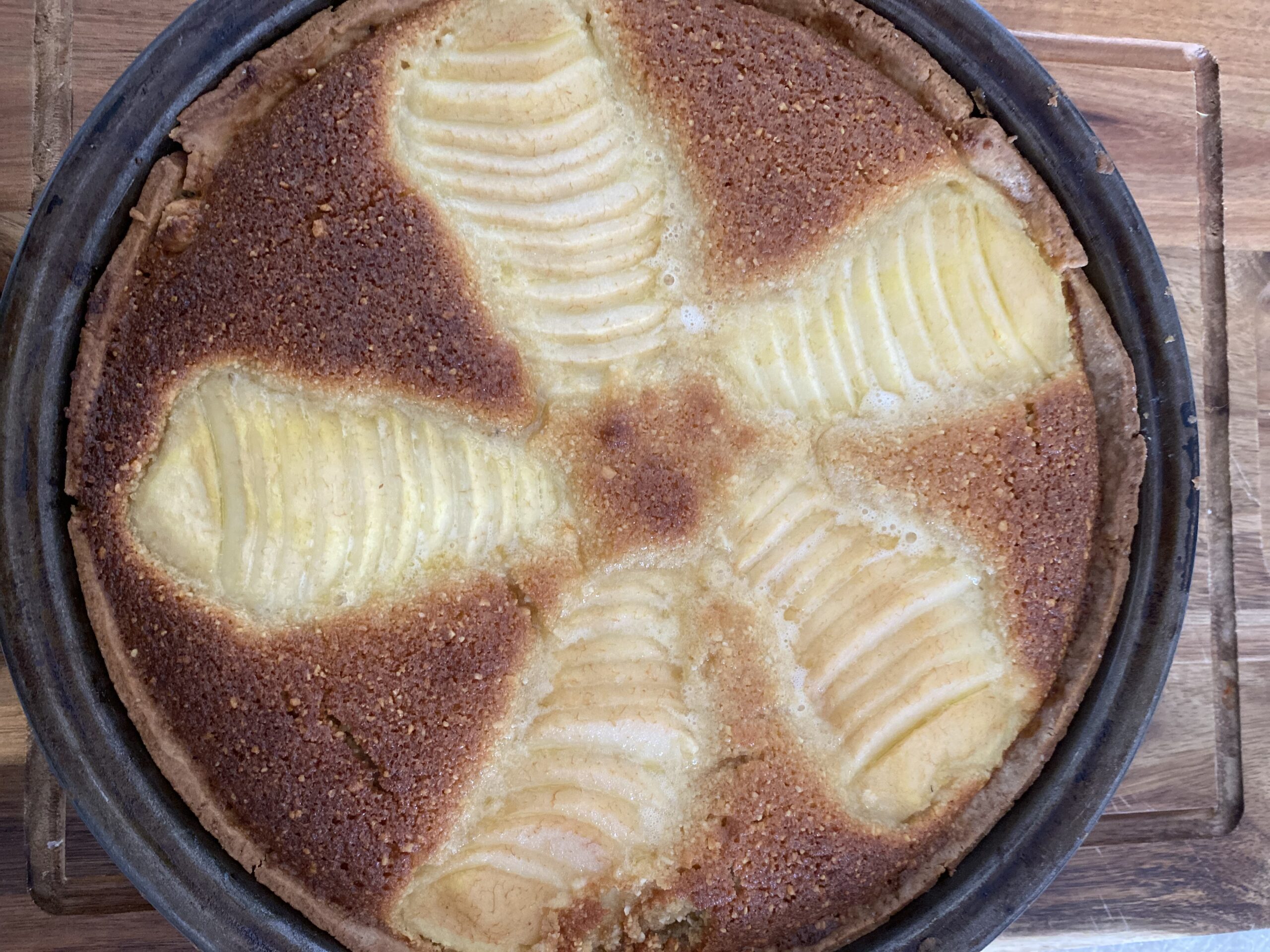– garnissez de la frangipane puis coupez les poires en lamelles et disposez –les sur la frangipane en biais.