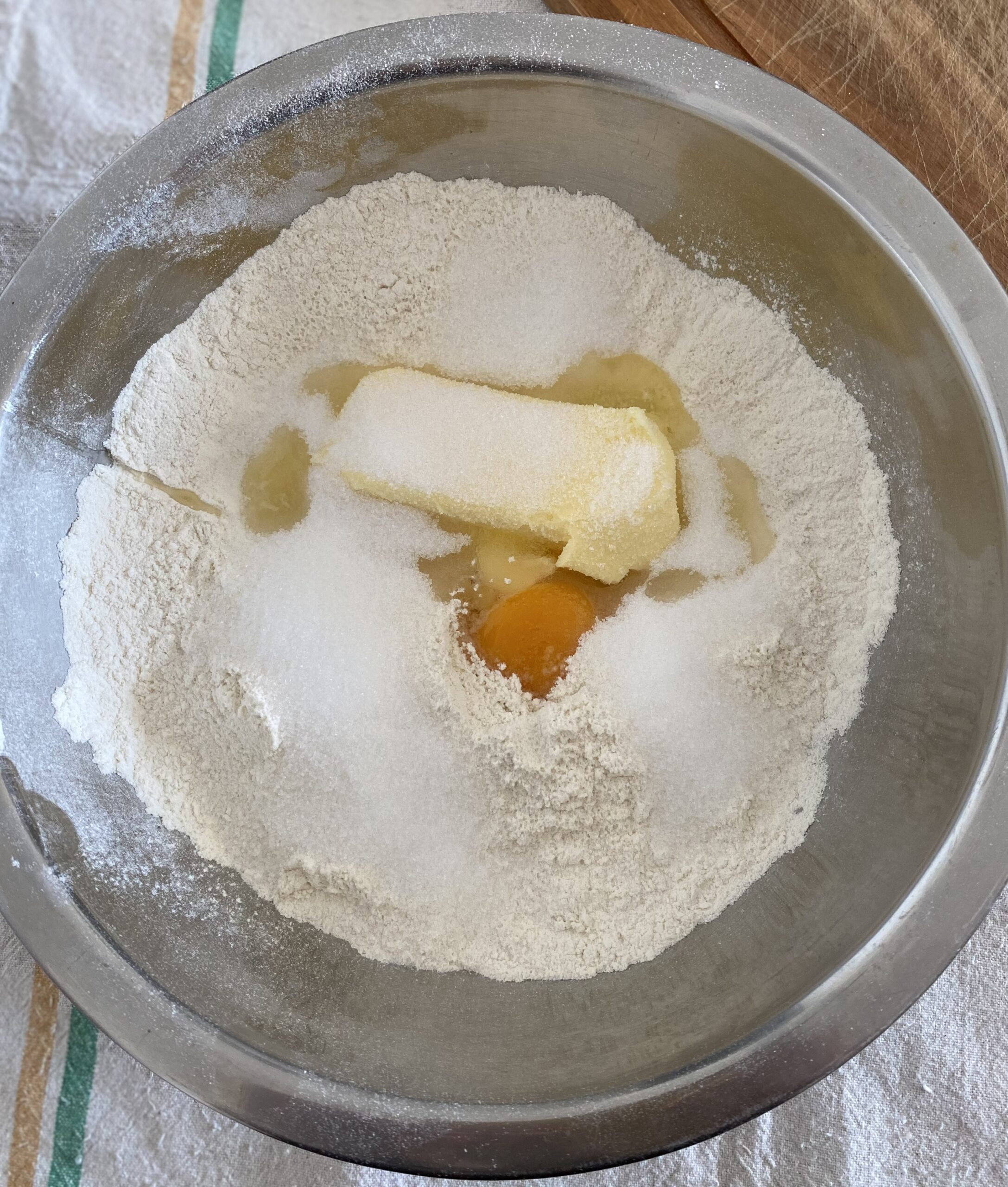 -dans un grand saladier tamise la farine et ajoutez le beurre et malaxez bien avec vos mains, jusqu’à obtenir un mélange soit sableux.