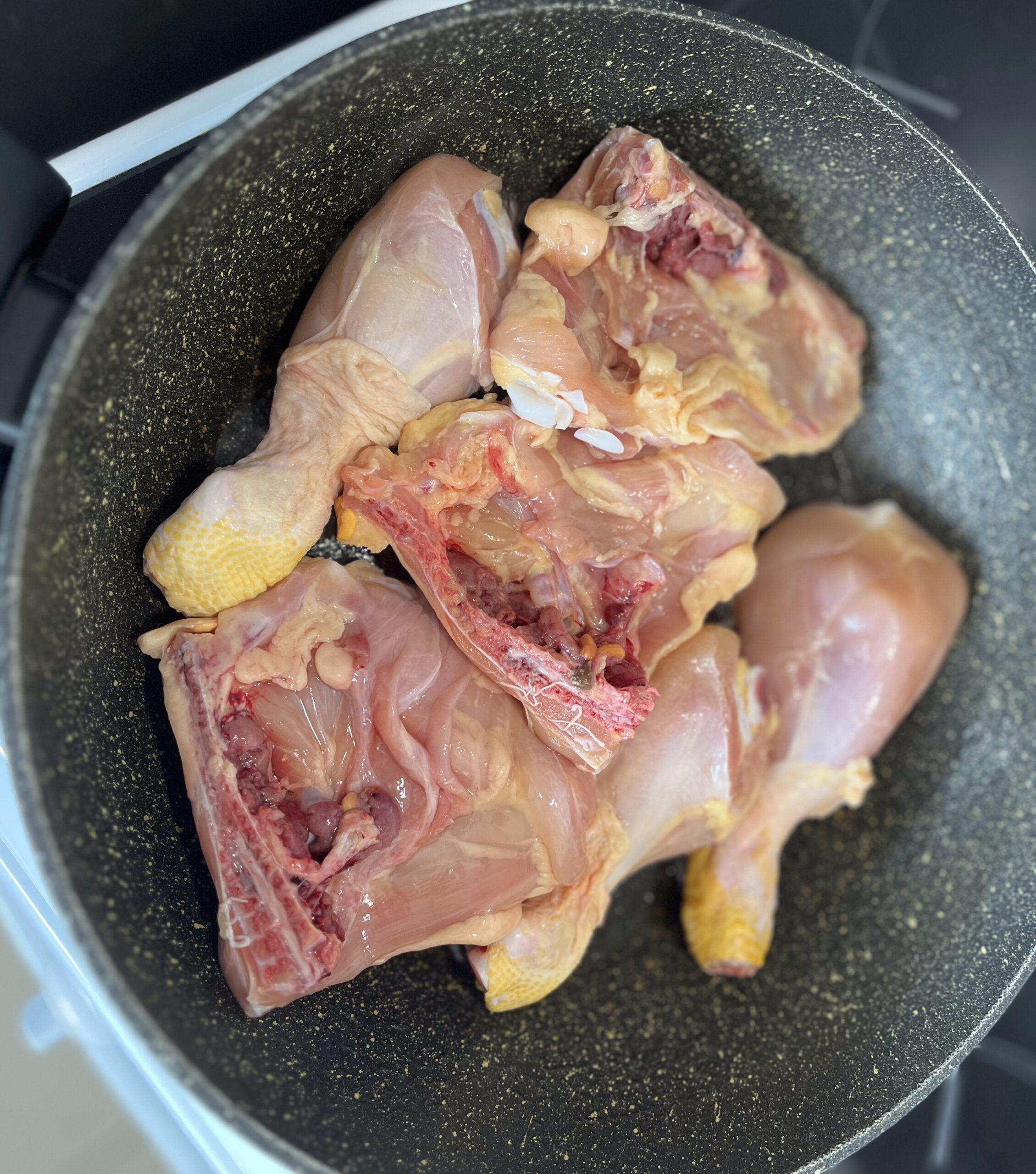 - ajoutez le poulet , vèrsez l’eau a hauteur , assaisonner avec le ras el hanoute et le cumin moulu ,sel et oivre , et les deux pots de concentré de tomate